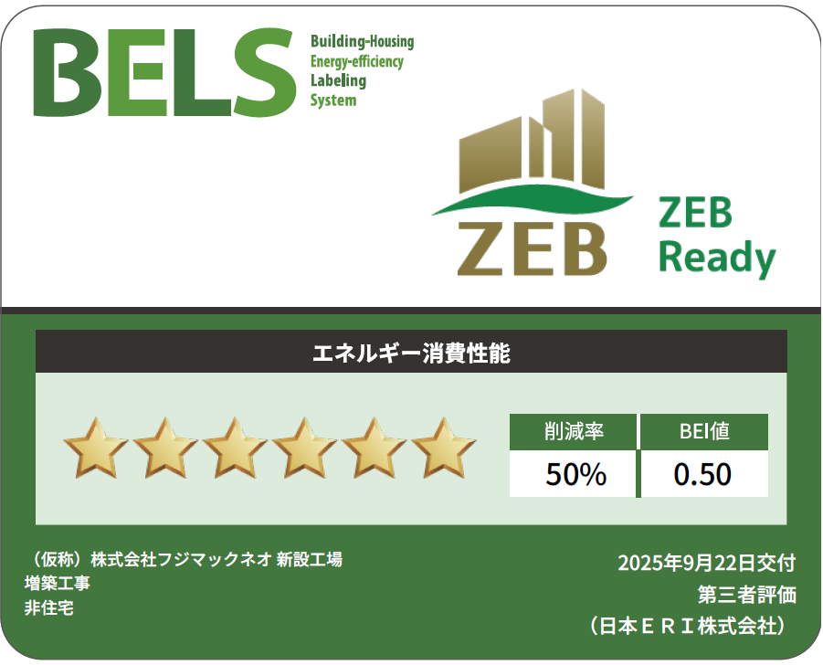 当社の子会社である株式会社フジマックネオの新工場を建設するにあたり、省エネルギー性能に優れた工場を目指した結果、建築物省エネルギー性能表示制度(BELS)に基づく第三者機関の評価において、九州に所在する工場としては初めて「ZEB Ready」の認証を取得いたしました(注2)。