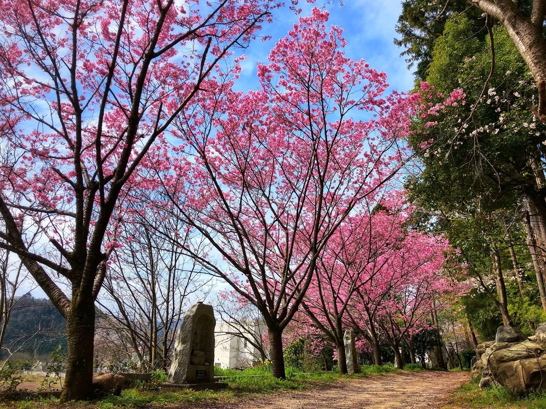 さらに、境内の八十八ケ所をたどって歩くと知らず知らずのうちにお寺の裏へと誘われるのですが、そこに咲き誇る陽光桜の並木が見事です。