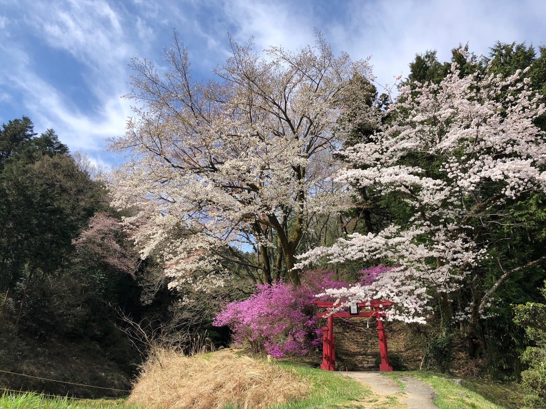 なんと言っても、弁天山への入り口での赤い鳥居と桜とツツジの共演が美しい!