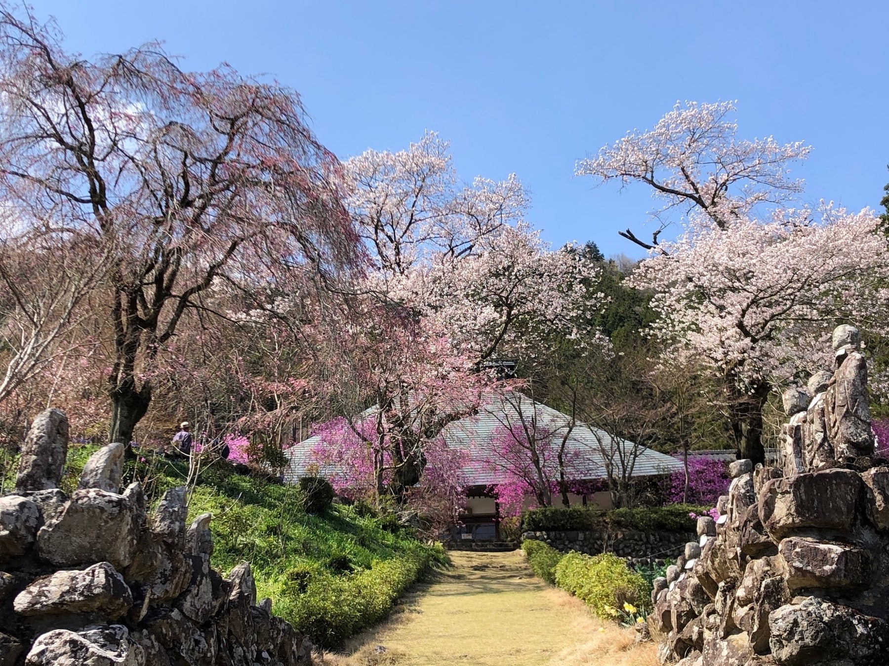 龍珠院というお寺では、石仏が並ぶ背景に、枝垂れ桜やツツジが色とりどりに咲き乱れます。