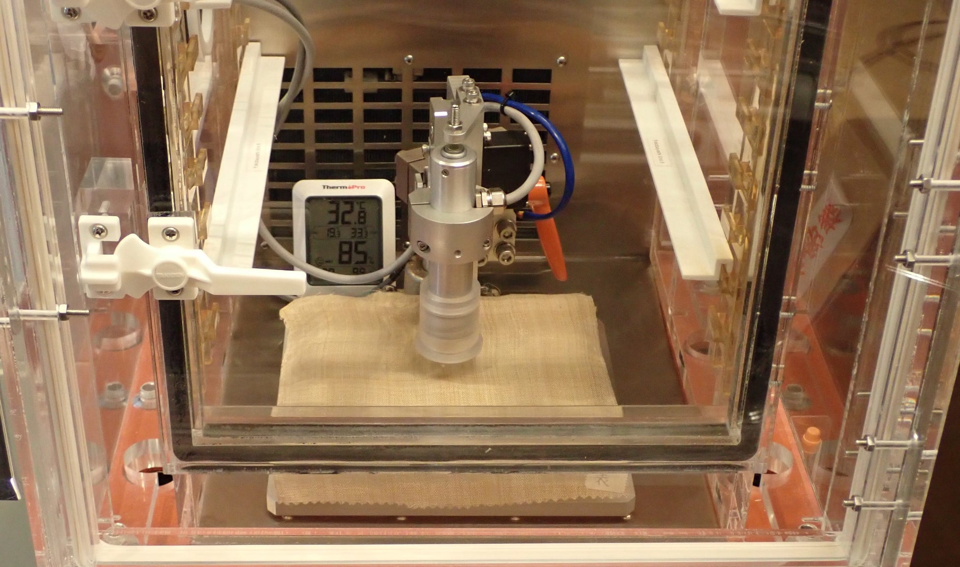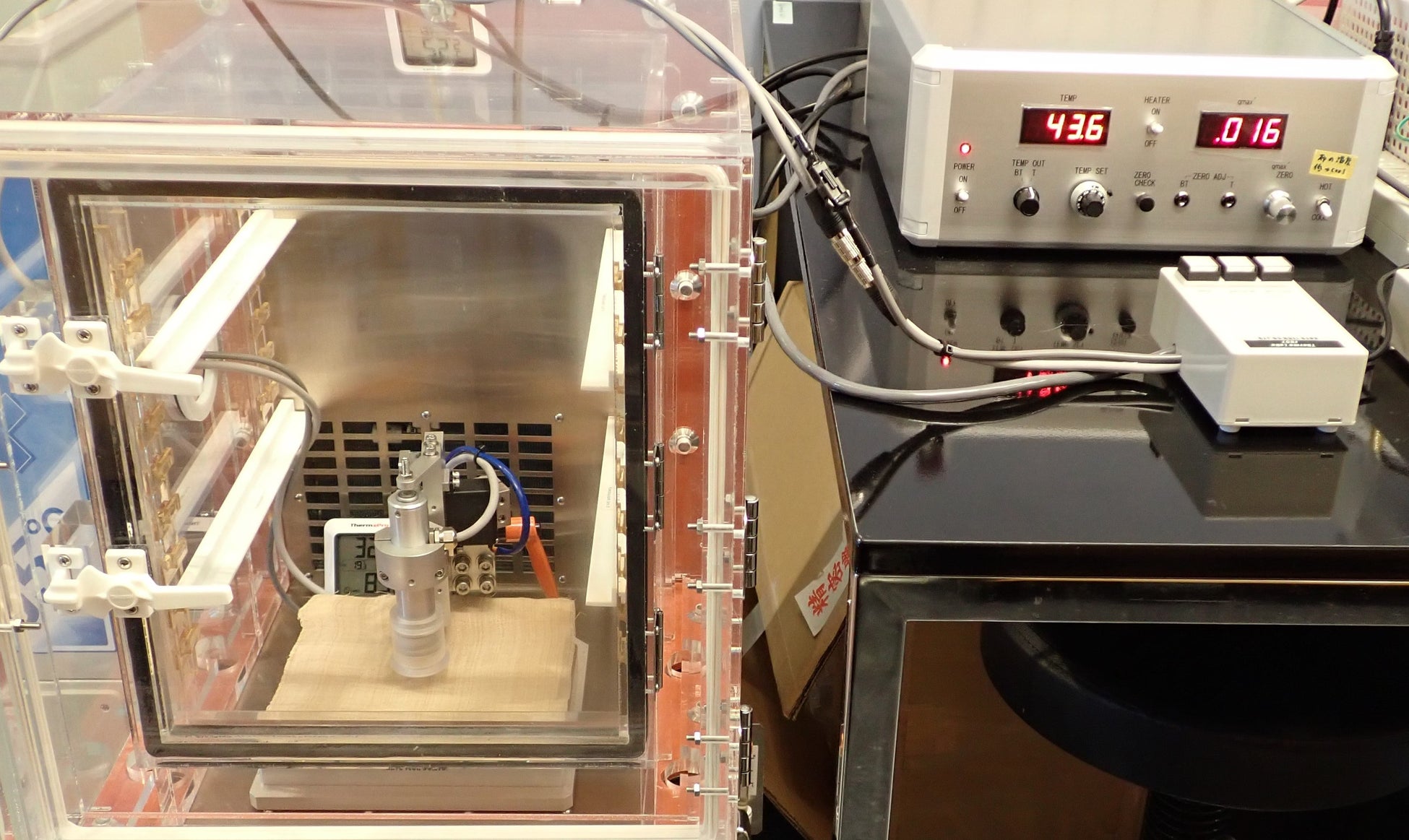 写真提供:OIST 野村博士 ※インキュベータ内に設置した温湿度計、32.8℃, 85%RH