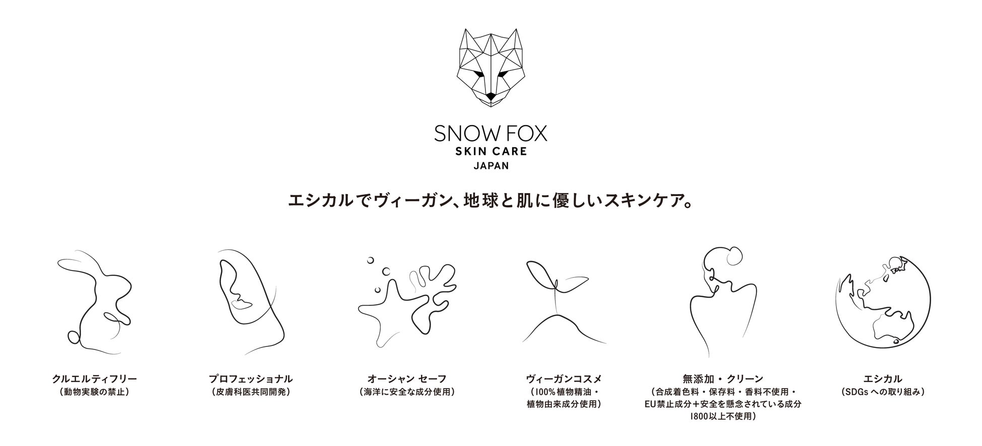Snow Fox Skincareは敏感肌・肌荒れに特化して無添加にこだわりプロフェッショナルに開発された、植物学と皮膚科学を融合したハイブリッド型スキンケアです。地球第一主義を理念に、ヴィーガン・エシカル・クルエルティフリー・クリーン・プロフェッショナル・オーシャンセーフの6つの哲学を商品開発理念に掲げています。