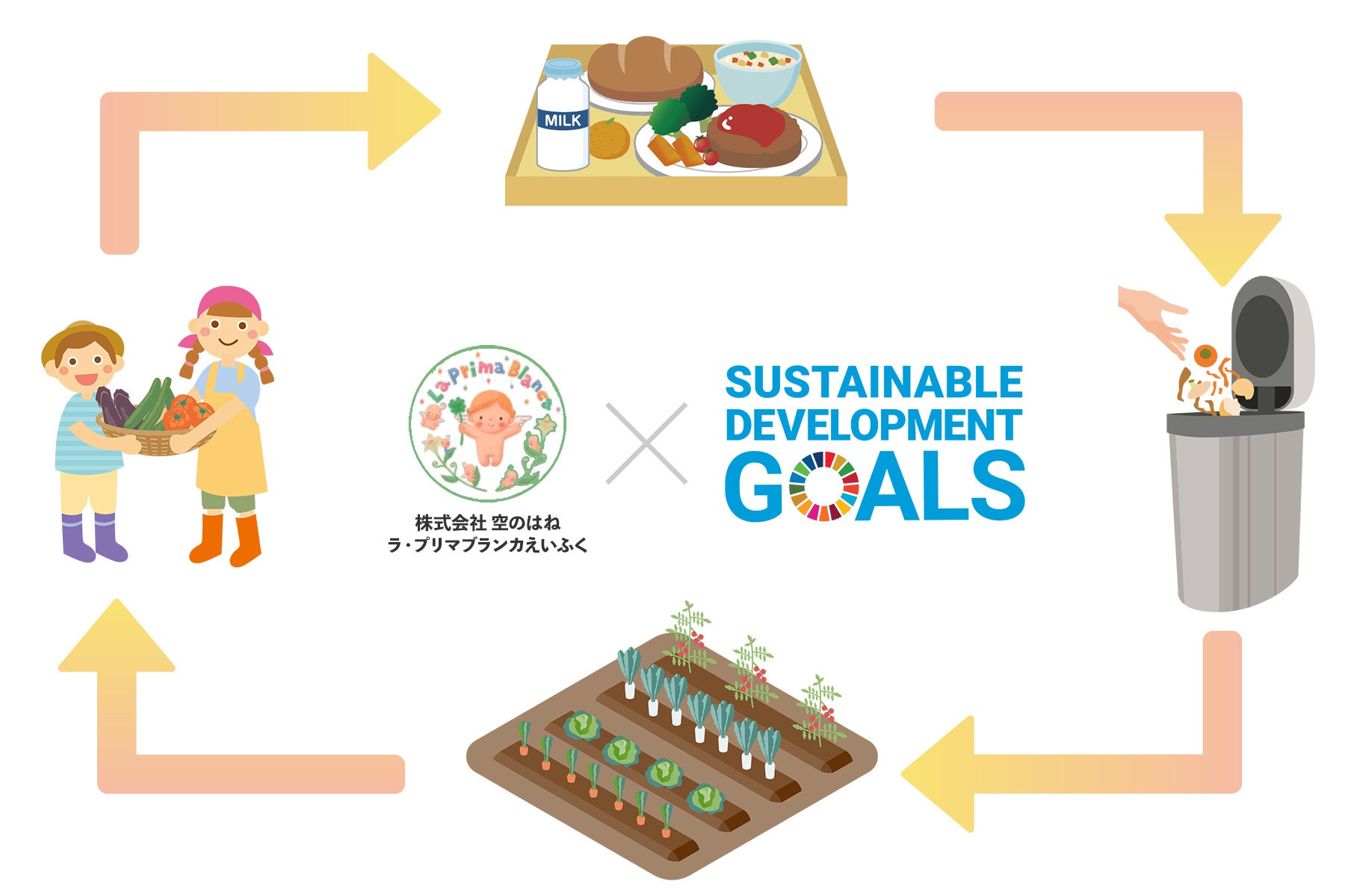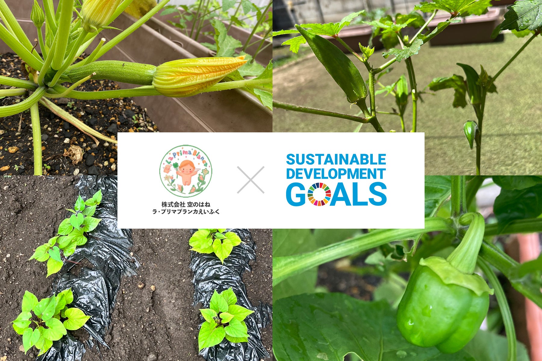 給食の残飯を生ごみ処理機にかけ、園庭で育てている野菜の肥料として再利用することで、子ども達は「食の循環」を学べます。実際に育てた野菜を収穫して食べる事は、心身の健康を確保するだけでなく、食への興味や関心も引き、嫌いなものでも食べてみようとする気持ちになり、フードロスにも繋がります。また、子ども達は食べ物の大切さを知り、感謝したりマナーや協調性などの社会性も同時に身に着けていきます。「ラ・プリマブランカえいふく保育園」を経営する株式会社空のはねでは、自園での野菜の栽培や食育活動を通して、子ども達と一緒に楽しく学びながら、SDGsへの取り組みを継続して参ります。