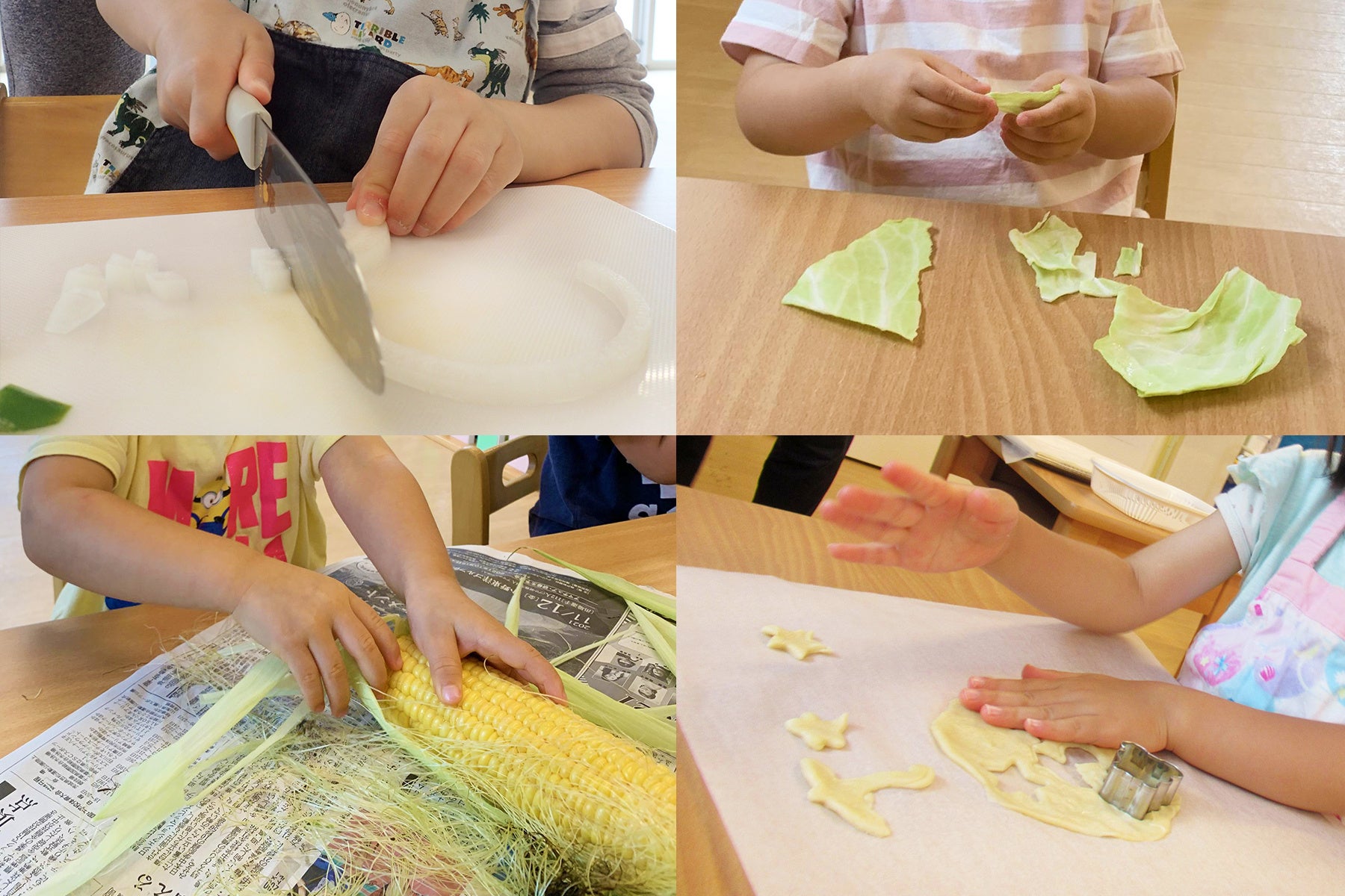 子ども達に野菜に対する興味や関心を持ってもらう為に、トウモロコシの皮むきやキャベツちぎり体験を行っています。トウモロコシやキャベツはどんな野菜?どんな色?どんな形?という事を子ども達自身で話しながら取り組み、食材への興味を深めます。