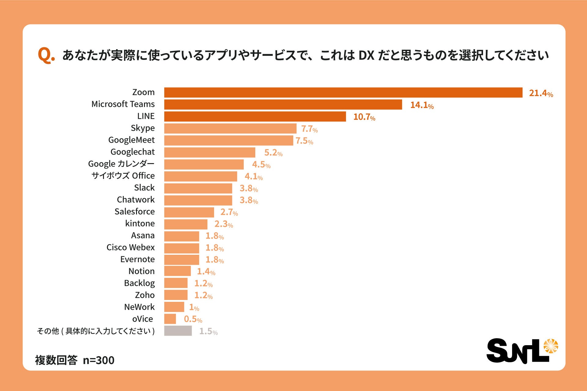 実際に使っているアプリやサービスで、これはDXだと思うものを聞いたところ、1位「Zoom」21.4%、2位「Microsoft Teams」14.1%、3位「LINE」10.7%とオンライン会議ツールが上位をしめる結果となった。