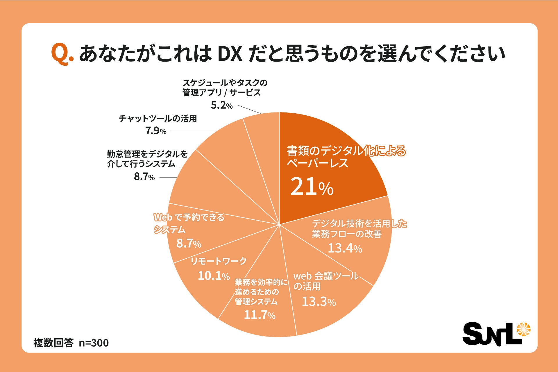 DXの認識を問う質問に対しては、「書類のデジタル化」で21.0%、次いで「デジタル技術を活用した業務フローの改善」13.4%、「web会議ツールの活用」13.3%が上位を占め、多くのビジネスパーソンが「書類のデジタル化」をDXだと認識していることが明らかになった。