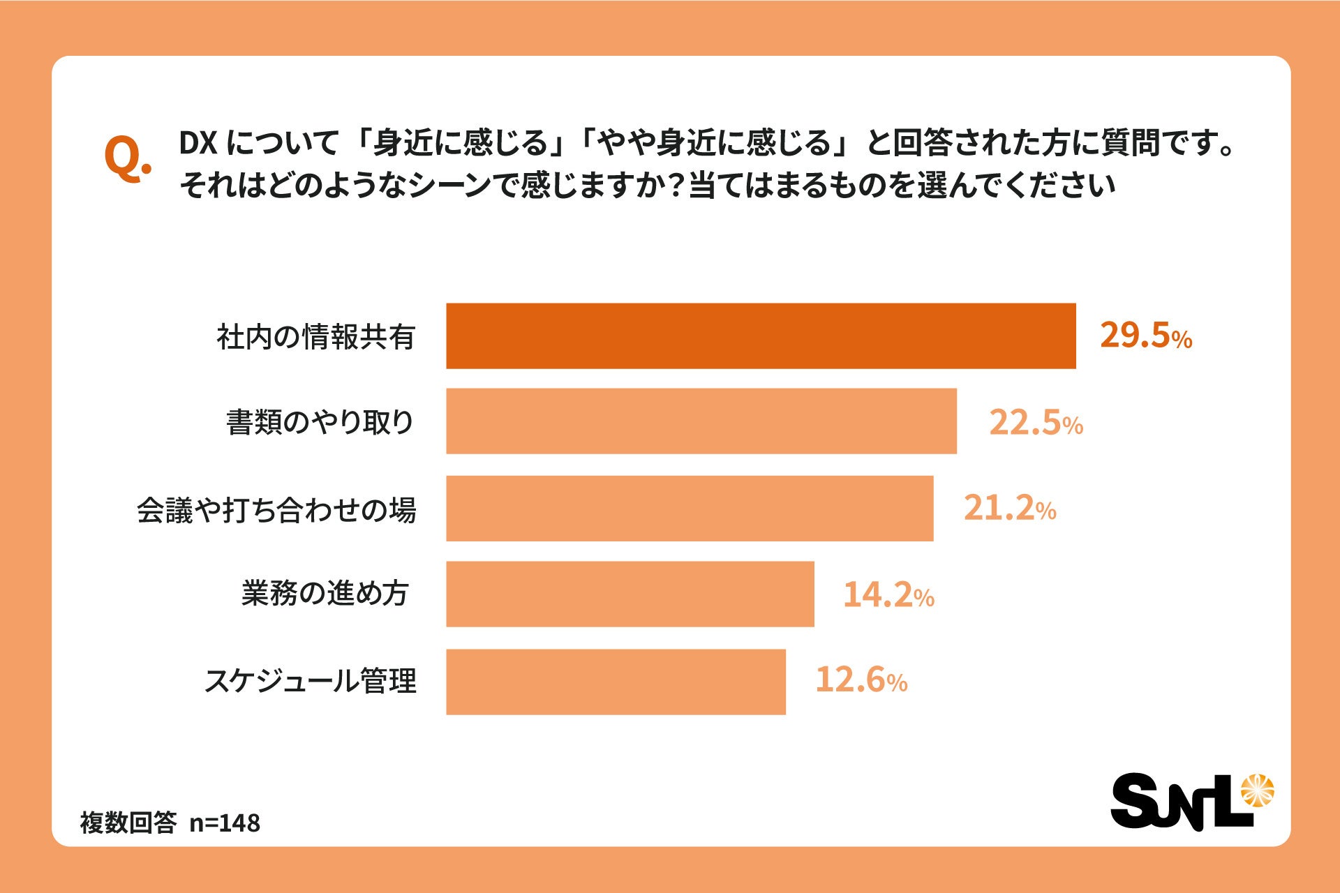 Q2で「身近に感じる」「やや身近に感じる」と回答した人に対して、DXを身近に感じる業務上の場面について聞いたところ、1位「社内の情報共有」が29.5%、2位「書類のやり取り」が22.5%、3位が「会議や打ち合わせの場」が21.2%となり、多くの社員が情報共有やコミュニケーションの場面でDXを感じていることが分かった。