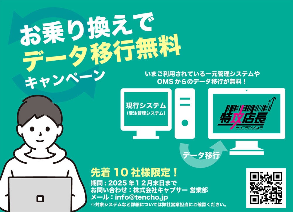 EC一元管理システム「特攻店長」を提供する株式会社キャプサー(本社:兵庫県神戸市/代表取締役:縄舟 優一)は、現在ご利用中の一元管理システム(OMS)から「特攻店長」へお乗り換えいただく法人様を対象に、受注データ・商品SKU・在庫データの移行を無料で実施するキャンペーンを開始しました。 実施期間は2025年12月31日まで。先着10社限定でのご提供となります。