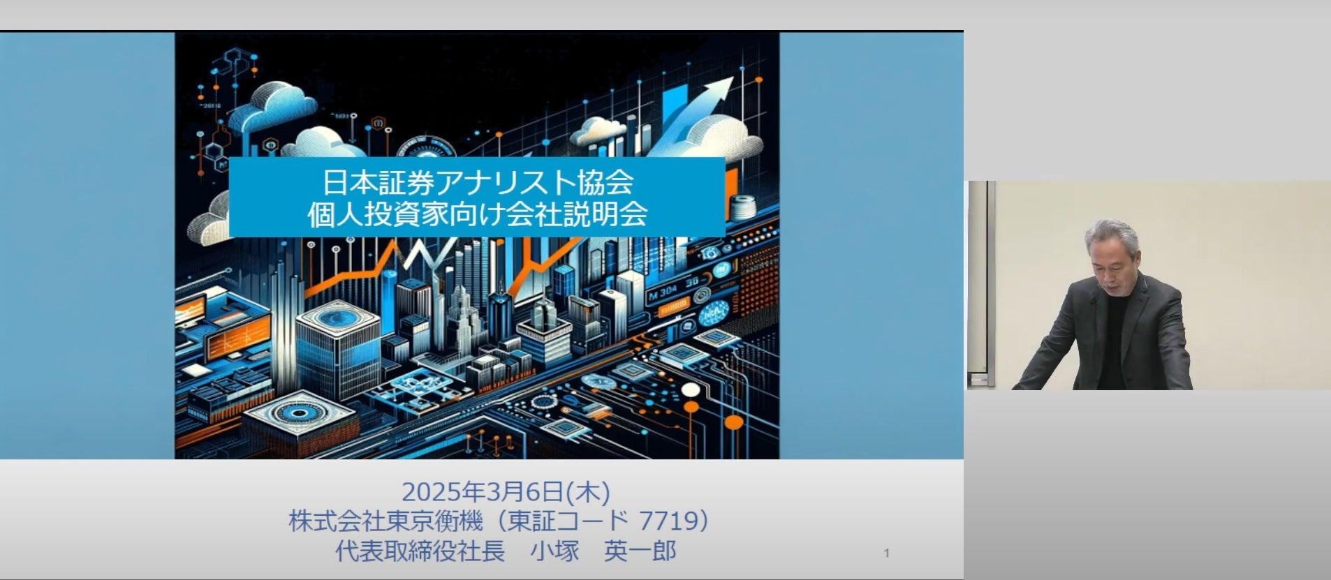 株式会社東京衡機(以下「当社」)は、去る3月6日、「個人投資家向け会社説明会」(主催:日本証券アナリスト協会)を開催し、多くの投資家の皆様にご参加いただきました。本説明会では、当社の代表取締役社長小塚英一郎が登壇し、当社の事業概要、中期経営計画、そして今後の東京衡機グループの成長戦略について説明を行いました。