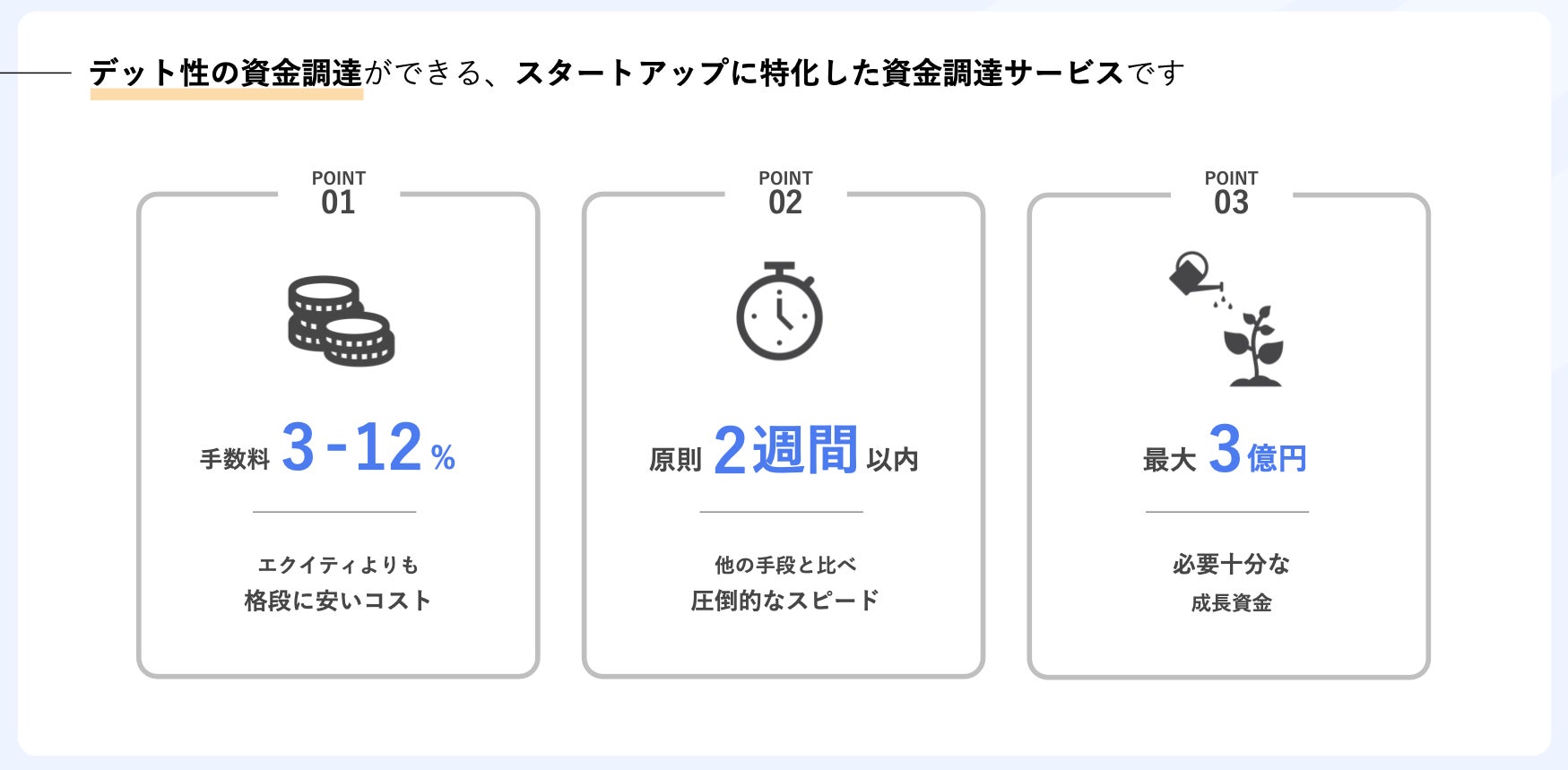 という3つの特徴を掲げ、先行投資が多いスタートアップ企業の資金ニーズに新たな選択肢を提案しています。