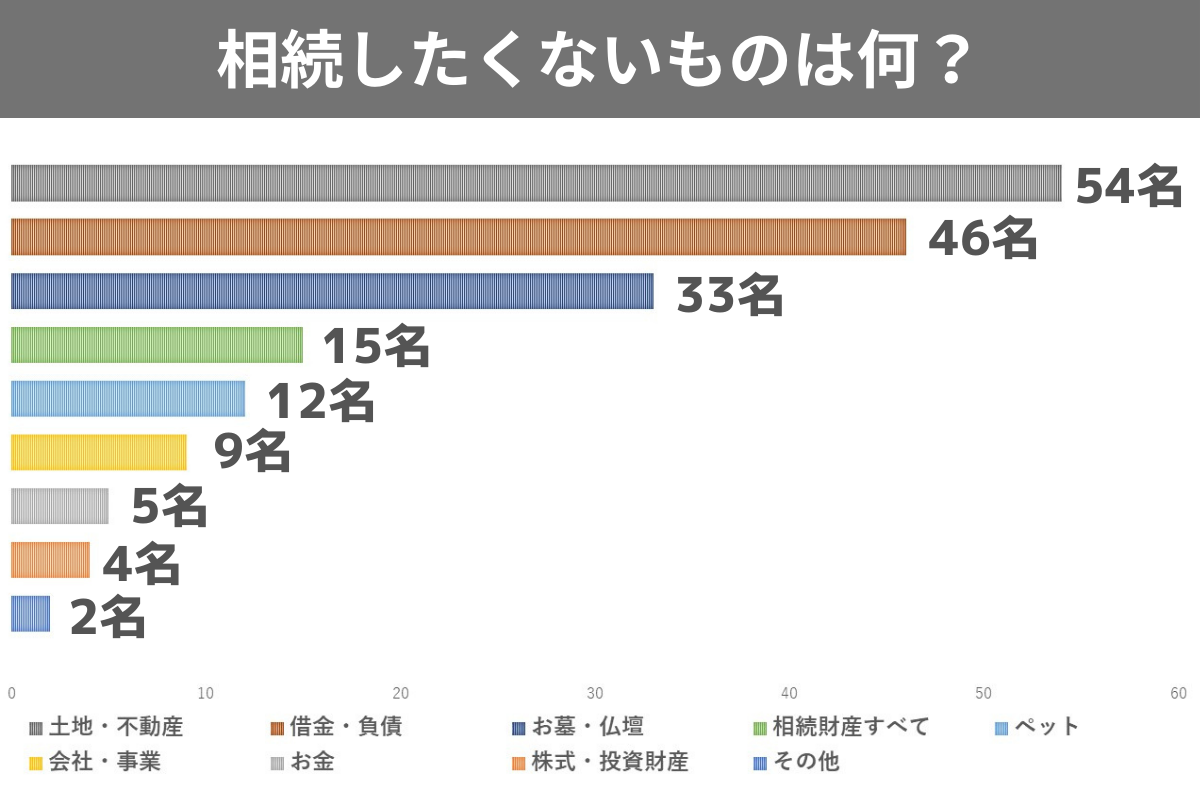 二番目に多かった借金・負債46名を上回り、3人に1人以上の人が土地や不動産を相続したくないと回答しており、多くの人にとって土地や不動産を相続することは負債を被るイメージがあるようです。