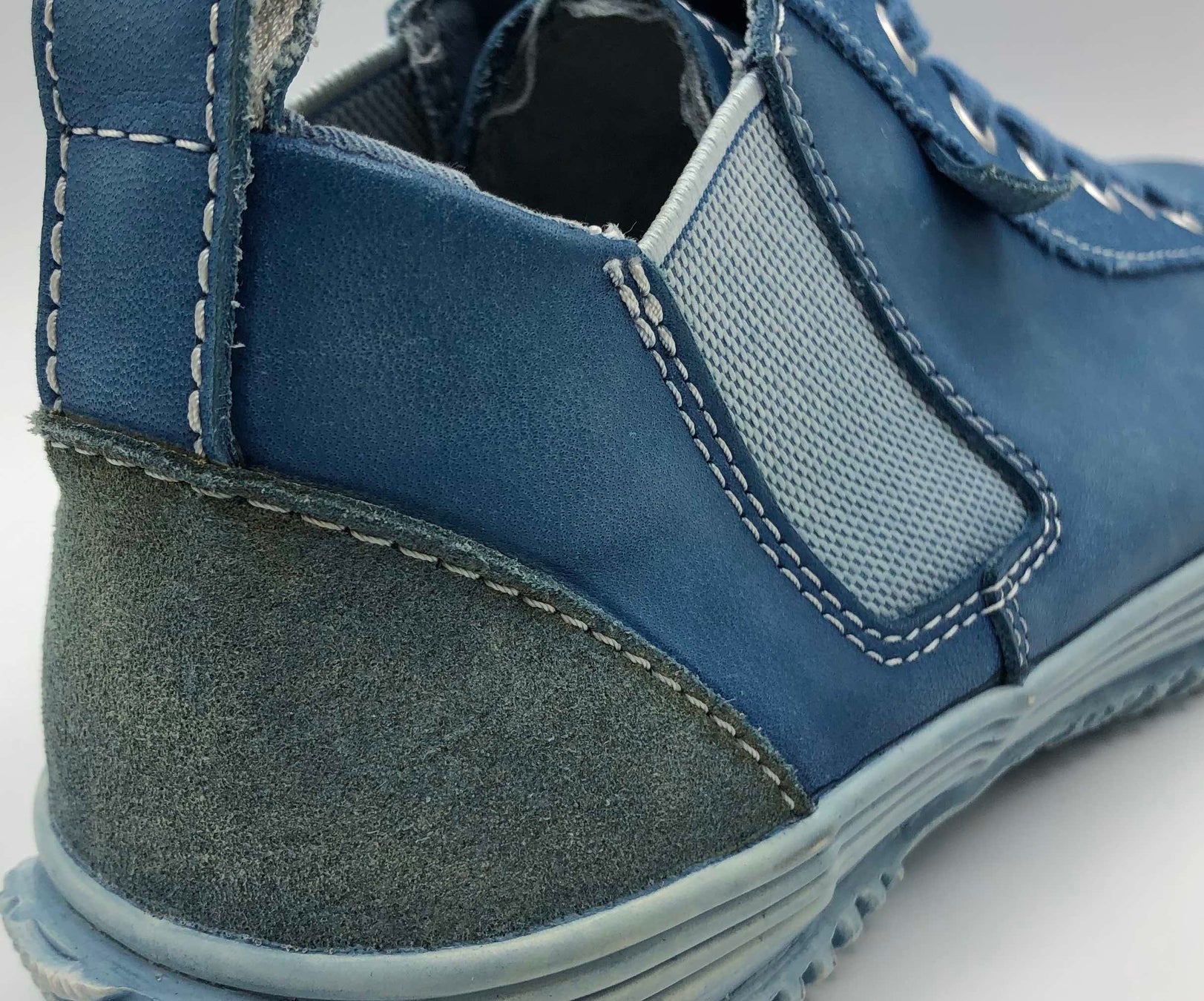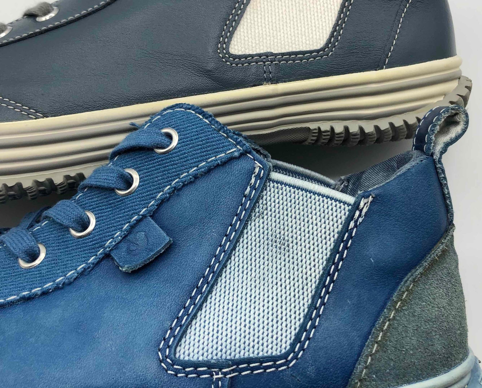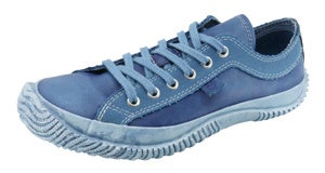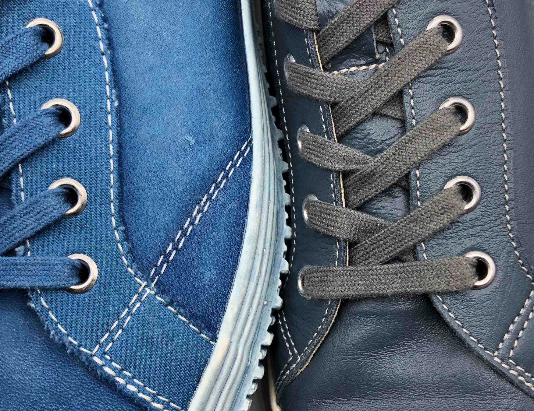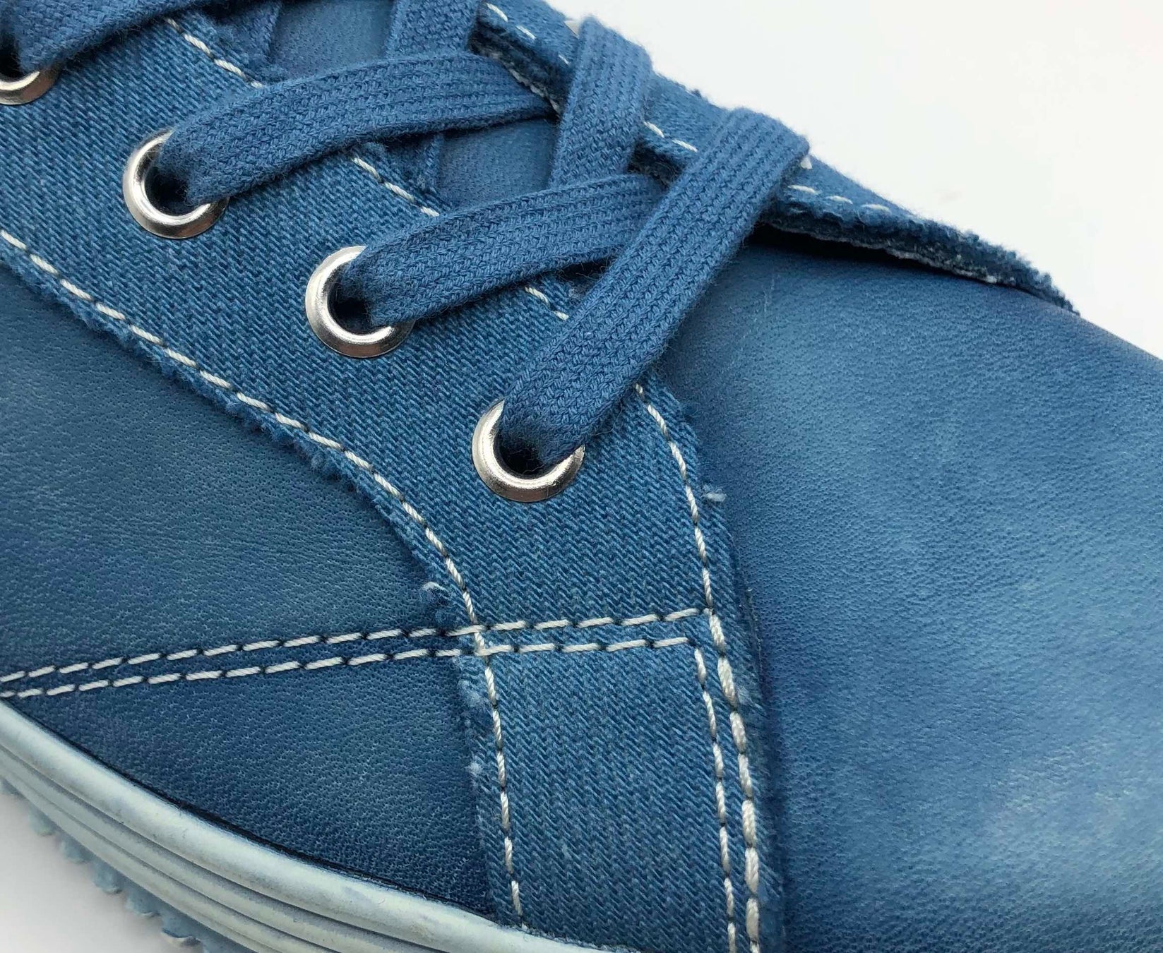 1)アッパーには、スピングルムーヴの定番素材である牛スムースと牛ベロア、デニムを連想させる綾織りの綿キャンバスなどの異素材同士を組み合わせることで、染め上がりのそれぞれの素材感を際立たせています。