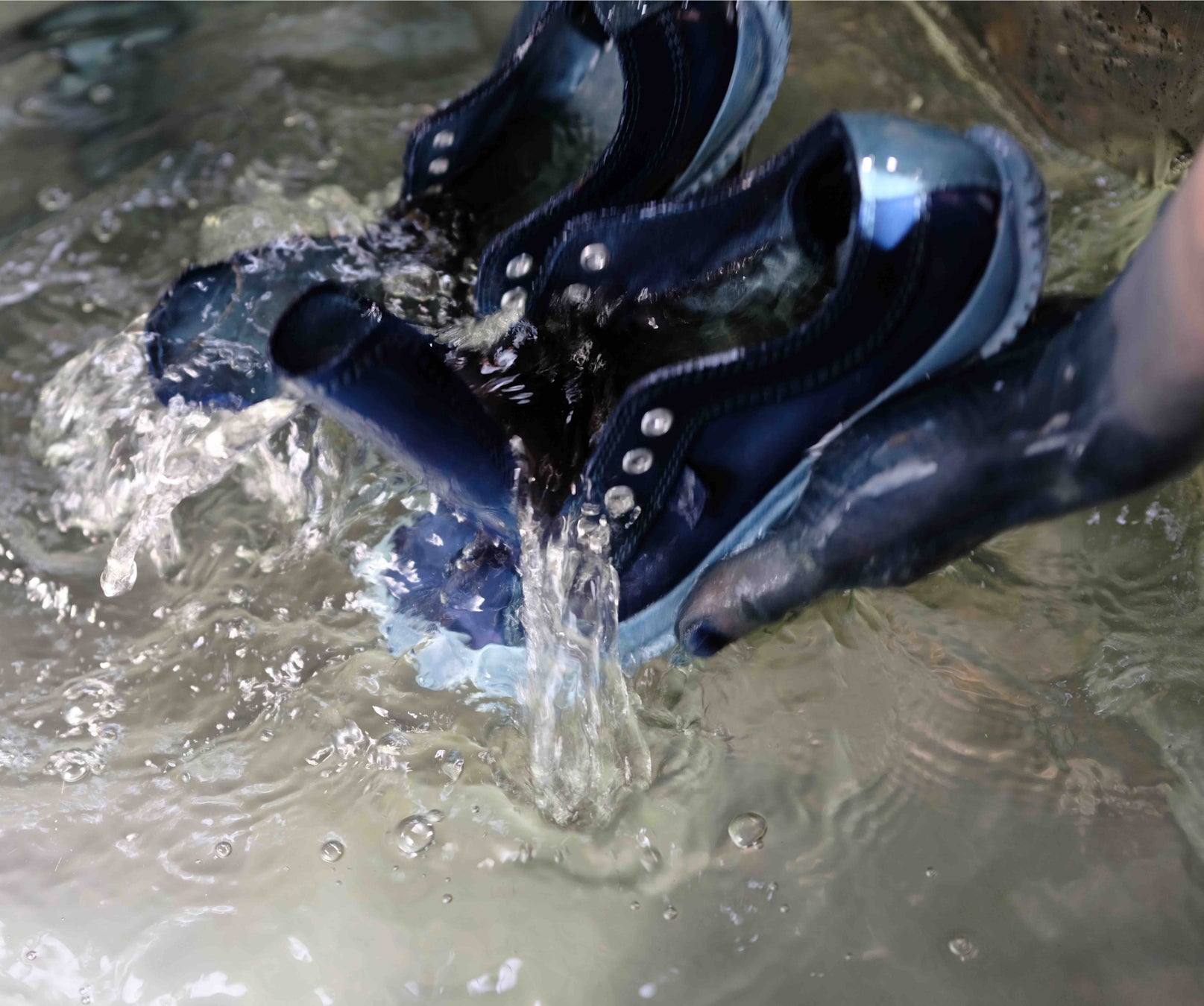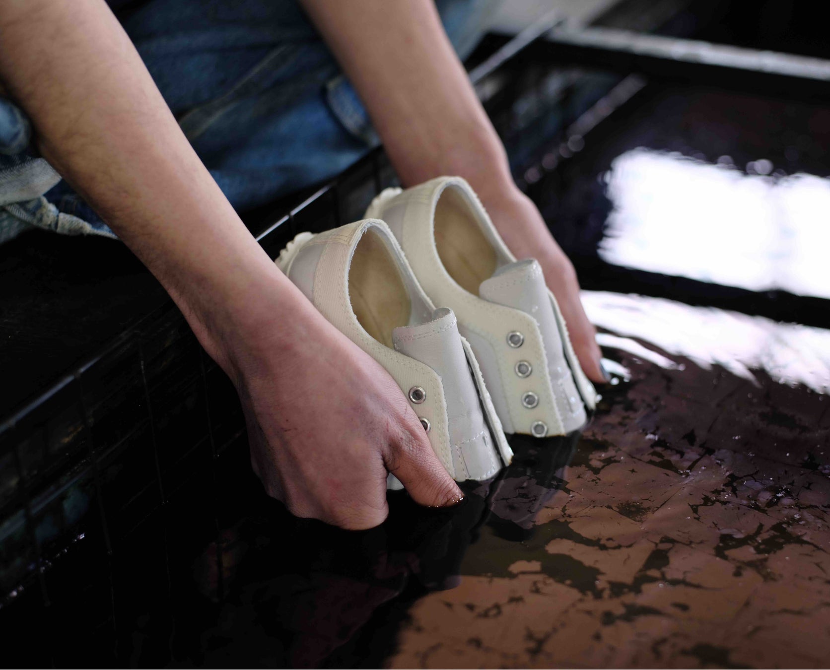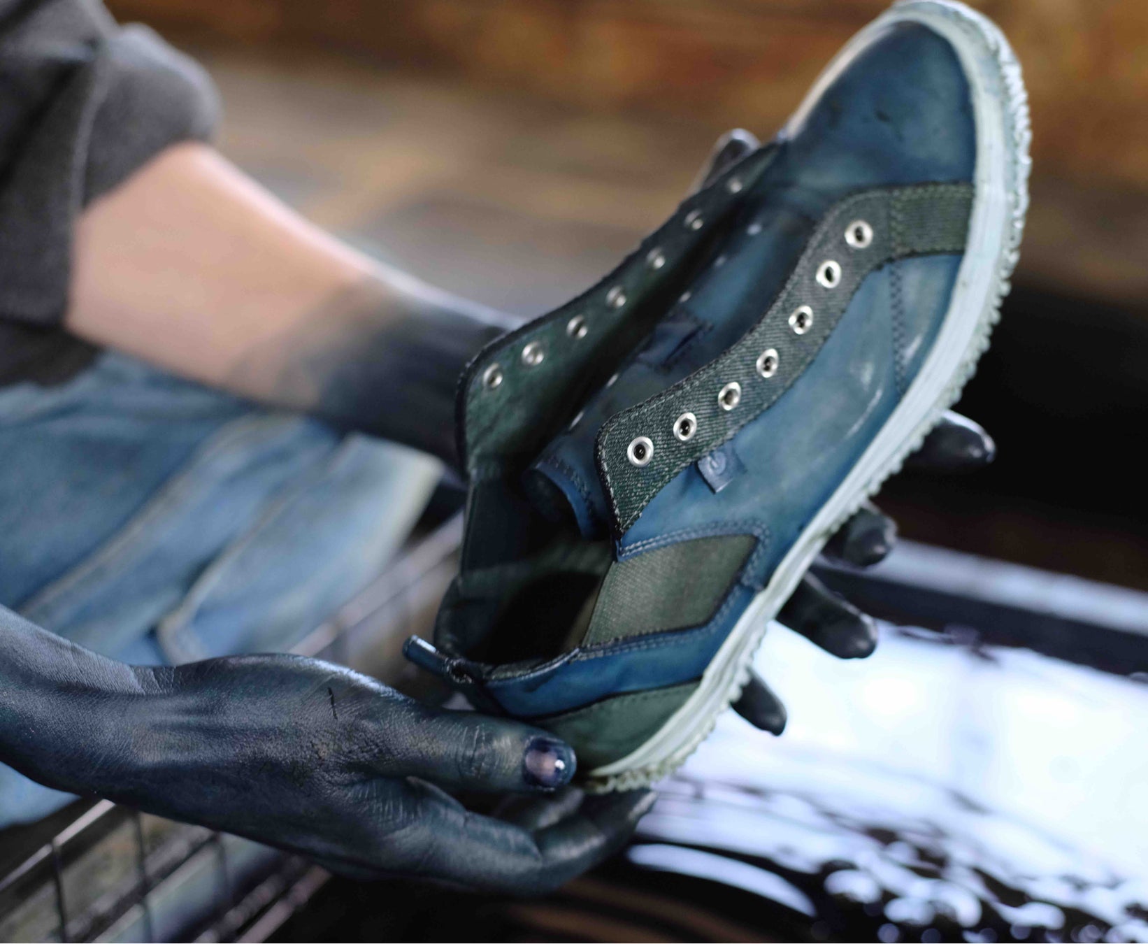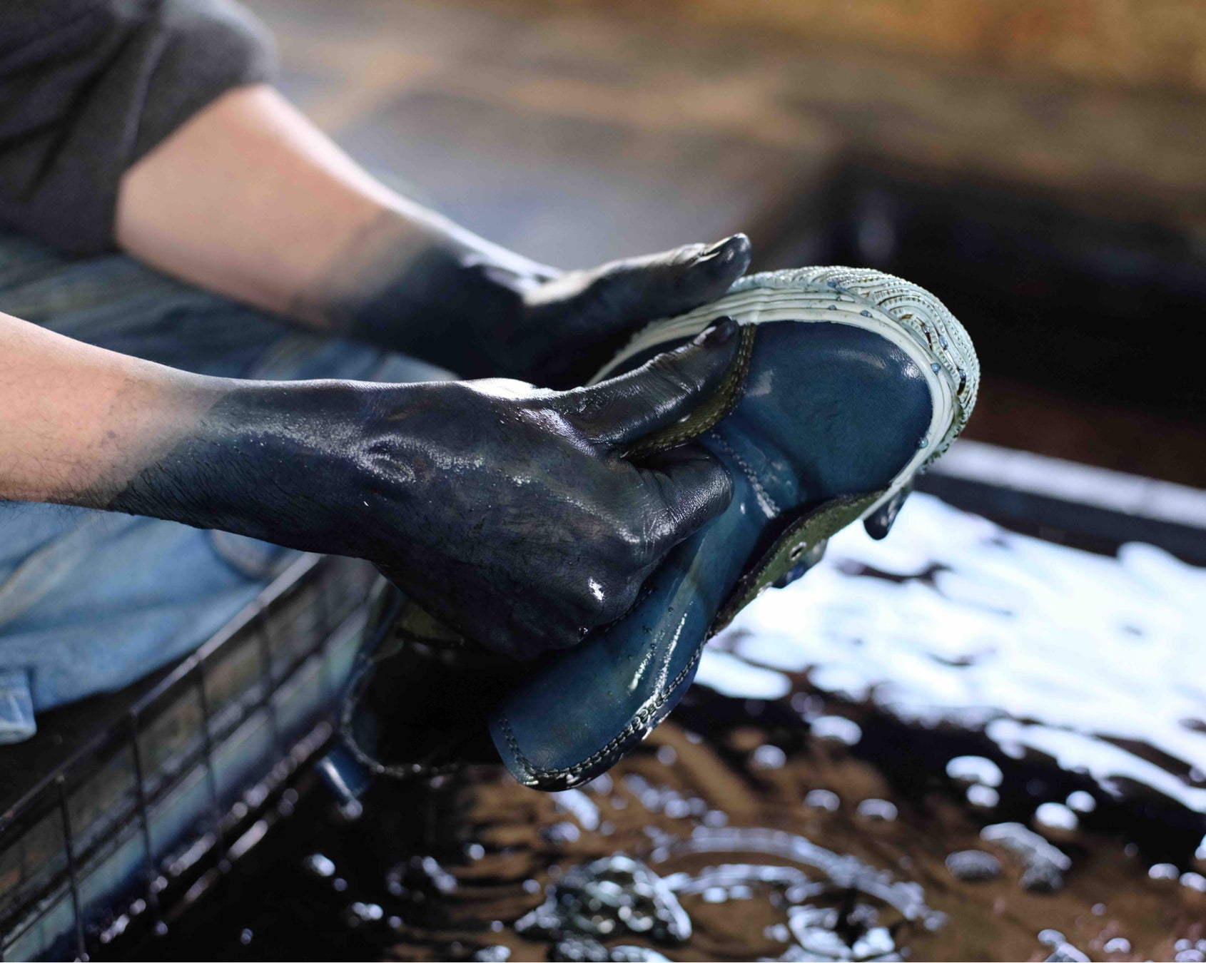 スピングルムーヴでは、デビュー以来「加工」にこだわったスニーカーを展開してきました。中でも特に印象深いのが2015年のSUMMERシーズンに、「東北」をテーマにあおもり藍で染めた「SPM-191」です。今回は20周年を記念し、当社に近い広島県福山市が国内最大のデニムの産地として名高いことから藍染工房を探していた折りに、国内でも珍しい藍の栽培から藍染までを一貫して行う「藍屋テロワール」に出会いました。当社と同じく「職人の町、備後」という同じ背景を持つブランドとして一緒にモノづくりがしたいと声掛けし、コラボレーション企画が実現しました。