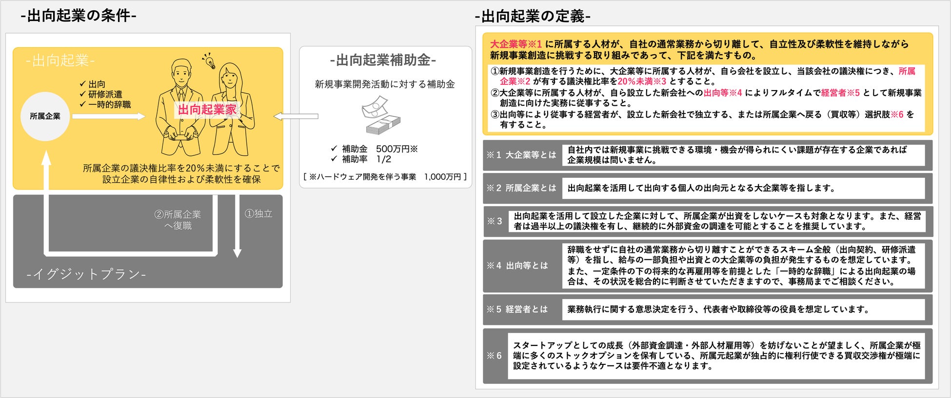 「出向起業補助金(一般枠)」では、⼤企業内では育てにくい新事業について、当該⼤企業社員が辞職せずに外部VC等からの資⾦調達や個⼈資産の投下を経て起業し、起業したスタートアップに⾃ら出向等を通じて新事業を開発する取り組み(=「出向起業」)