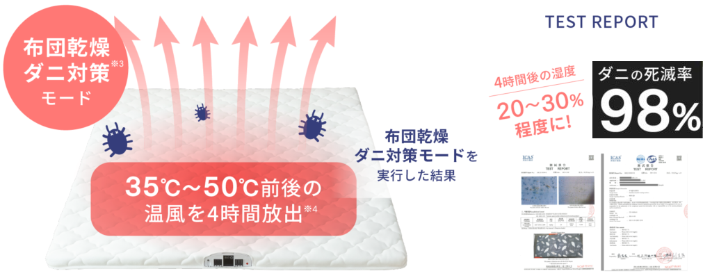 ・布団乾燥・ダニ対策モード … 高温風をマットレス内に送り、高温と乾燥によりダニ・カビ対策が可能です