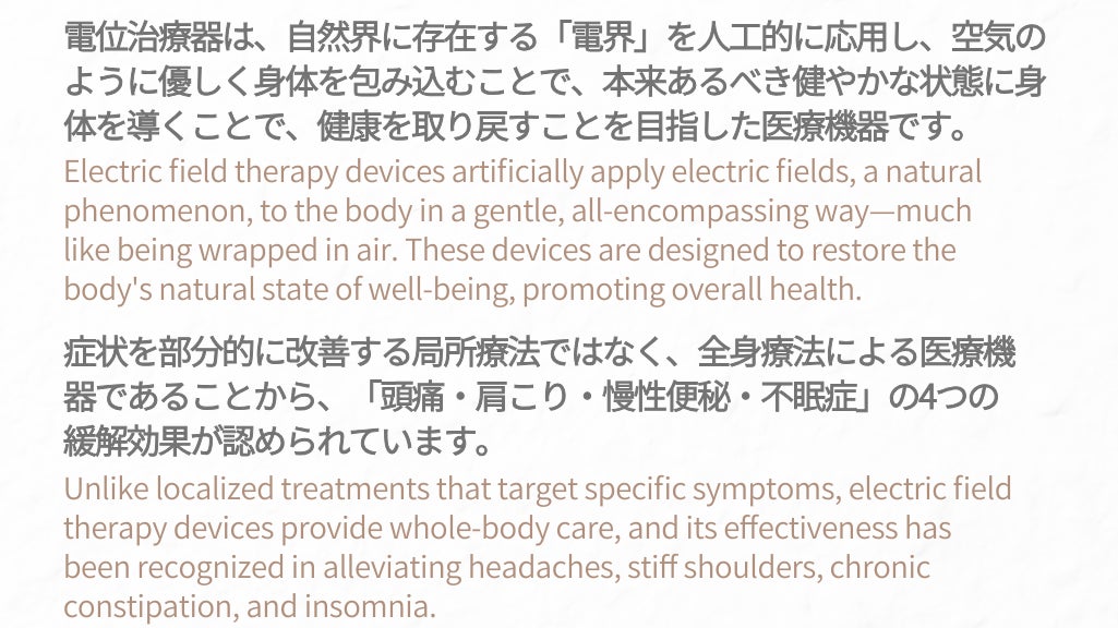 電位治療器とは、自然界に身近に存在する電界の力を人工的に応用し、空気のように優しく身体全体を包み込むことで治療をする、非侵襲性(生体に傷をつけない)の医療機器です。現に身体に生じている症状に投薬や手術により直接アプローチをする対症療法ではなく、自然治癒力に働きかけて、身体を本来あるべき状態に整えることで治療を目指す、根本療法をコンセプトとしています。