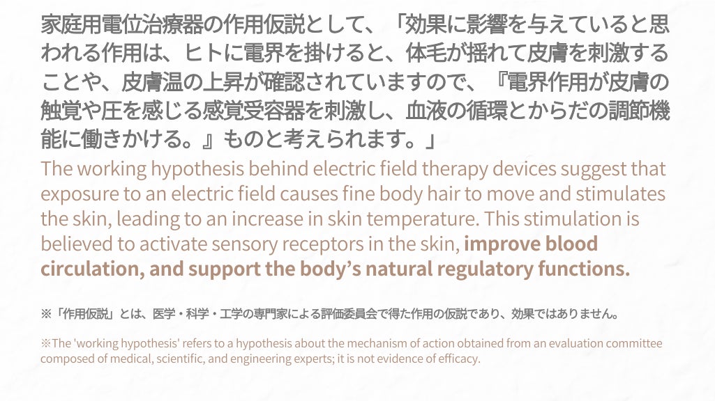 人生100年時代を迎え、健康寿命の延伸が叫ばれるなかで、自身で健康を管理し病気を未然に予防する「セルフケア」を浸透させることが、社会的に重要性を増しています。そのなかで、”座りながら””寝転がりながら”治療ができる電位治療器の利便性をさらに拡大させ、最先端の科学技術との融合を図ることで、知らずのうちに電界治療を受けて健康を維持できる、当社の考える2050年の「いのち輝く未来社会」をご提案しています。