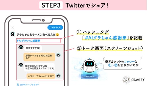 3.ご自身のTwitterアカウントにてハッシュタグ「#AIグラちゃん感謝祭」を記載し、