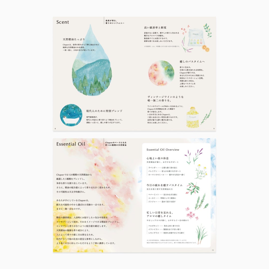 今回のブランドブックでは、25年以上にわたり4万人以上の入浴を医学的に調査してきた温泉療法専門医・早坂信哉教授(東京都市大学人間科学部)の監修のもと、入浴効果の科学的根拠についてコメントいただきました。さらに、手触り感のある質感の高い紙種を採用し、天然精油100%へのこだわりを表現するアースカラーを基調としたデザインに一新しました。全体を通して、湯気や温かみを感じさせる心地よいビジュアル表現を施しています。