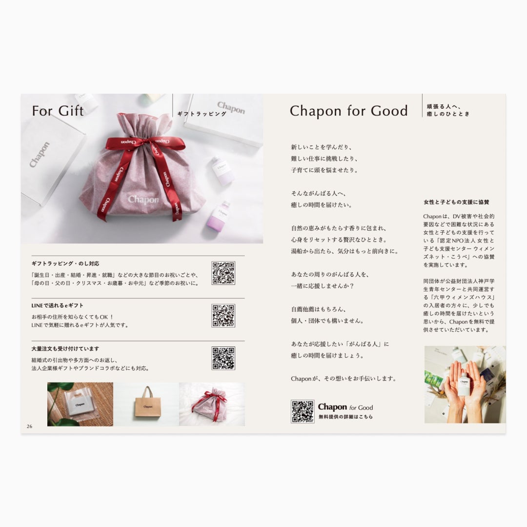 株式会社Tokel(本社:東京都板橋区、代表取締役:瀬戸口翔大)は、高級入浴剤ギフトブランド「Chapon(チャポン)」のブランドブックを全面刷新し、Version 3.0 (全28ページ) として本日より公開いたしました。本日以降の全ての商品発送分に、このブランドブックが同封されます。
