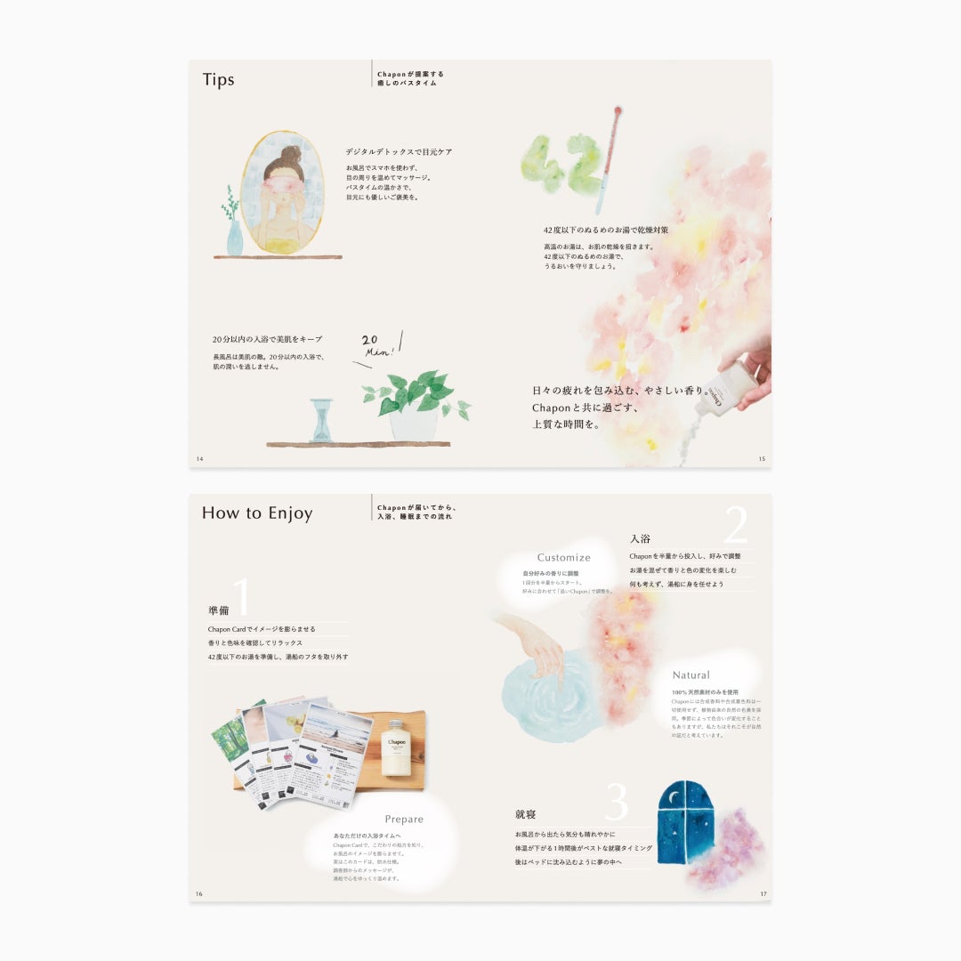 「単に情報を届けるためのものではなく、バイブルのように手元に置いておけるような冊子を目指しました。プロダクトを媒介として"癒し"というテーマに真摯に向き合うChaponの姿勢を体現するブランドブックに仕上がったと思います」