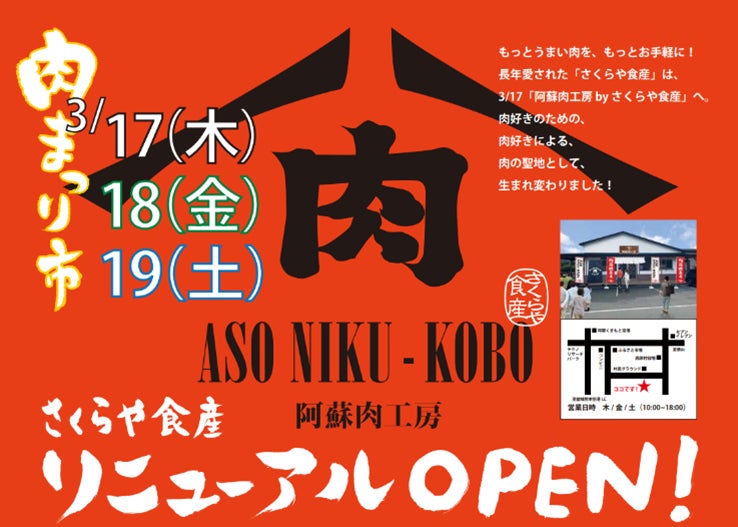 食に特化した事業承継を行う、まん福ホールディングス株式会社(本社:東京都渋谷区、代表取締役社長:加藤智治、以下「まん福HD」)が2社目に受け継がせていただいた食肉加工会社さくらや食産(本社:熊本県阿蘇市、代表取締役社長:福田哲也、以下 「さくらや食産」)が、3月17日(木)に「阿蘇肉工房byさくらや食産」へと生まれ変わり、自社直売店、「阿蘇肉工房」をリニューアルオープンいたします。