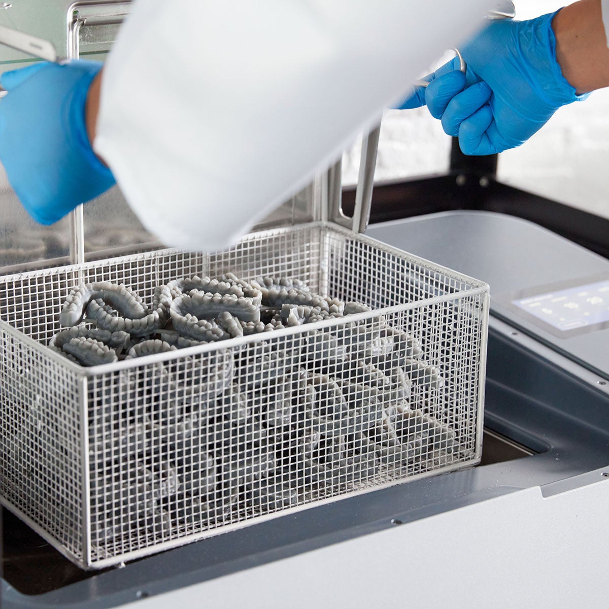 Form Autoは、Form 3、Form 3+、Form 3B、Form 3B+の4機種に対応。プリント完了後に自動で造形品を取り外し、専用のUVシールド容器に保管します。また、UVシールド容器内のバスケットはForm Wash Lにそのまま投入でき、まとめて後処理が行えます。これによって人の手を介さず連続的にプリントが継続でき、内蔵カメラで各プリントの動画や画像がリモートでも確認できます。夜間や土日祝日に人員を配置する必要がなく、最大80%の省力化が実現できます。
