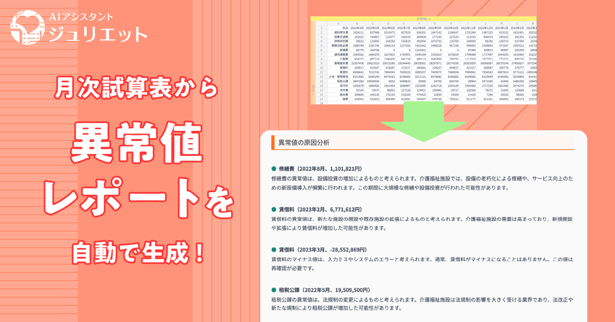 そんなある日、田中さんはジュリオ株式会社が開発したAIアシスタント「ジュリエット」の新機能「異常値レポート」を導入することにしました。これは、月次試算表を入力するだけで、AIが統計的な異常値を検出し、その原因と対策を分析した結果をまとめたレポートを自動で作成するというものです。