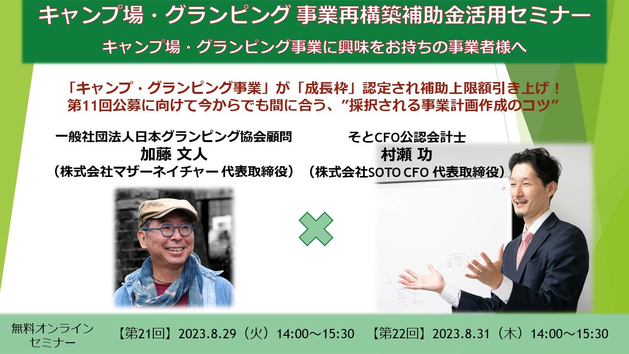 「キャンプ・グランピング事業」が「成長枠」認定され補助上限額引き上げ!第11回公募に向けて今からでも間に合う、”採択される事業計画作成のコツ”をお伝えするセミナーを開催します