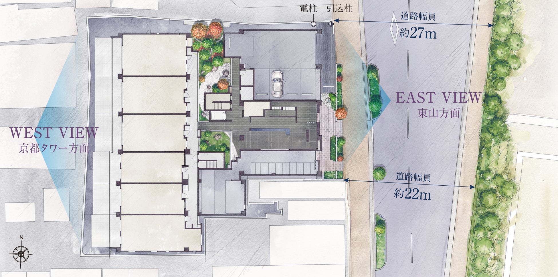 建物前面には最大約27mの広さを有する大和大路通が目前の東山の緑と相まって伸びやかな開放感に包んでくれます。また西側の住戸からは京都タワーなど京都市街の景色も一望できます(一部住戸)。