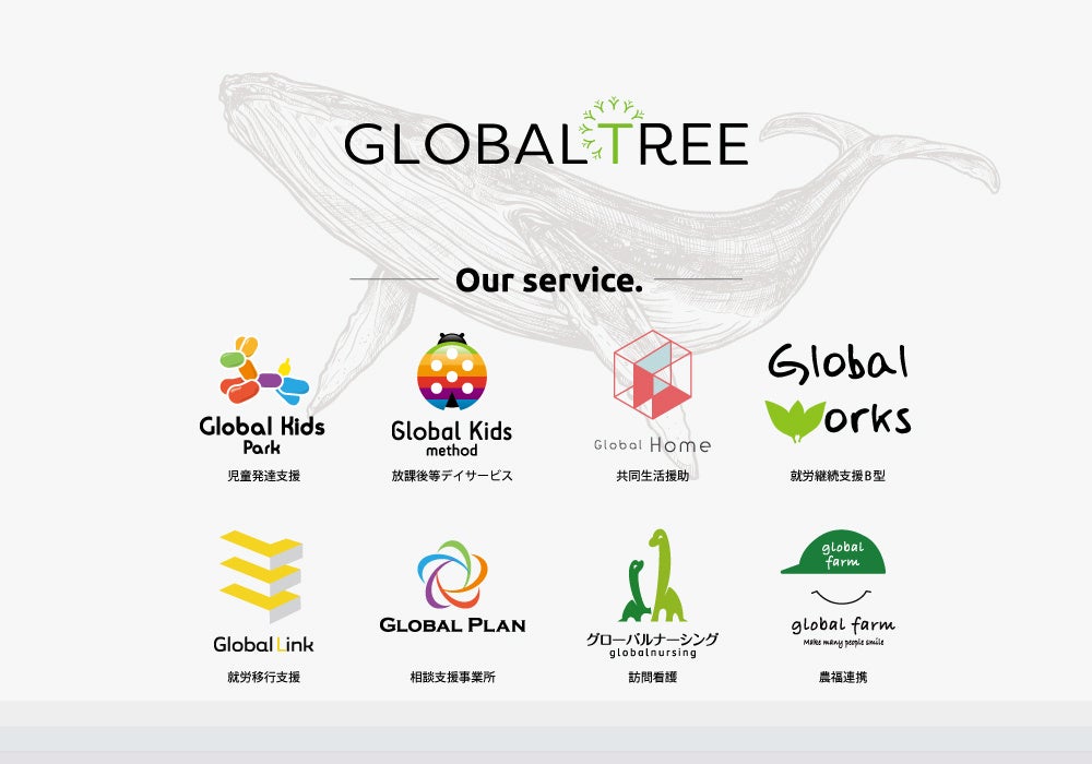 2023年4月現在、8つの福祉分野を展開するGLOBALTREEグループ。子ども達のその先の未来を見据えた福祉サービスが必要であることにも着目し、18歳から利用可能な就労支援や、住まいを提供する障がい者グループホームの運営。1歳からシニアの幅広い世代までを対象とした福祉分野の一生涯をサポートする「トータルライフケア」を展開しています。