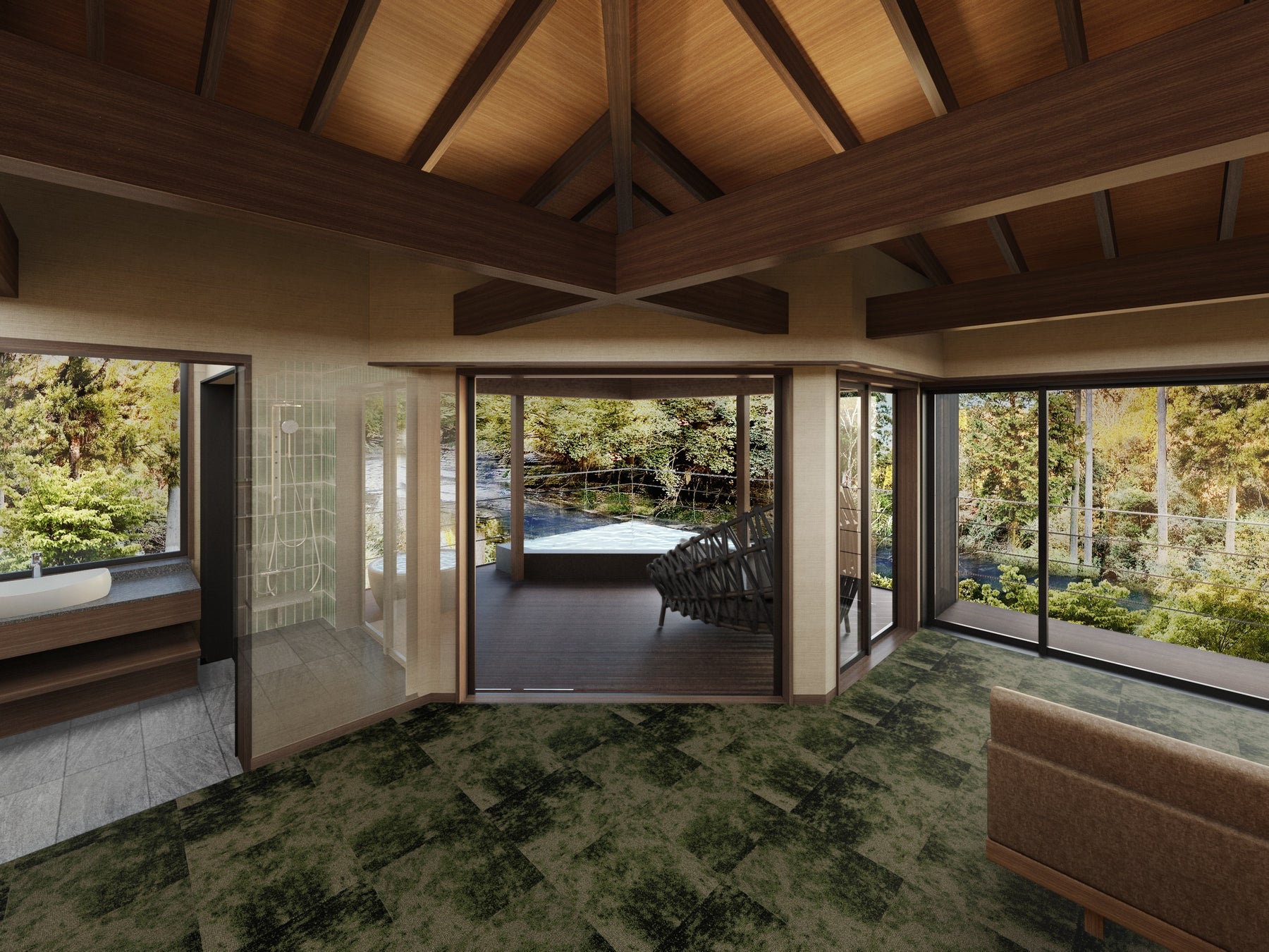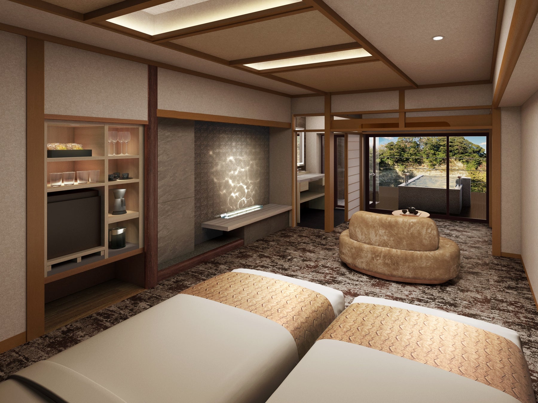 せせらぎを聴きながらプライベートな温泉を楽しめる露天風呂付のゲストルームをはじめ