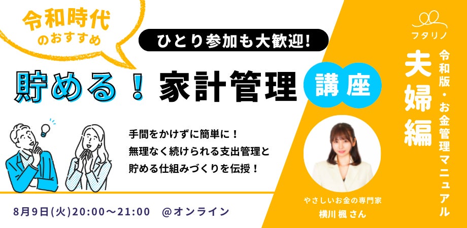 8月9日(火)貯金ができる夫婦になる!【簡単・続く】令和時代の夫婦の家計管理講座