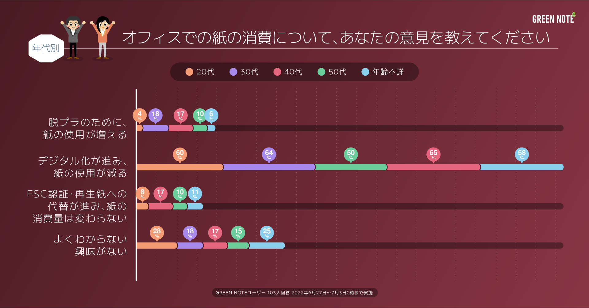 Greenroom株式会社(本社:東京都新宿区、代表取締役:山崎 修平)が運営するサステナビリティ / SDGs専門ニュースアプリ『GREEN NOTE(グリーンノート)』は、SDGsやサステナブルに関する意識を明らかにすることを目的に、サステナビリティに感度の高いアプリユーザー20~50代以上の103名を対象に「オフィスでの紙の消費」に関する市場調査を実施。