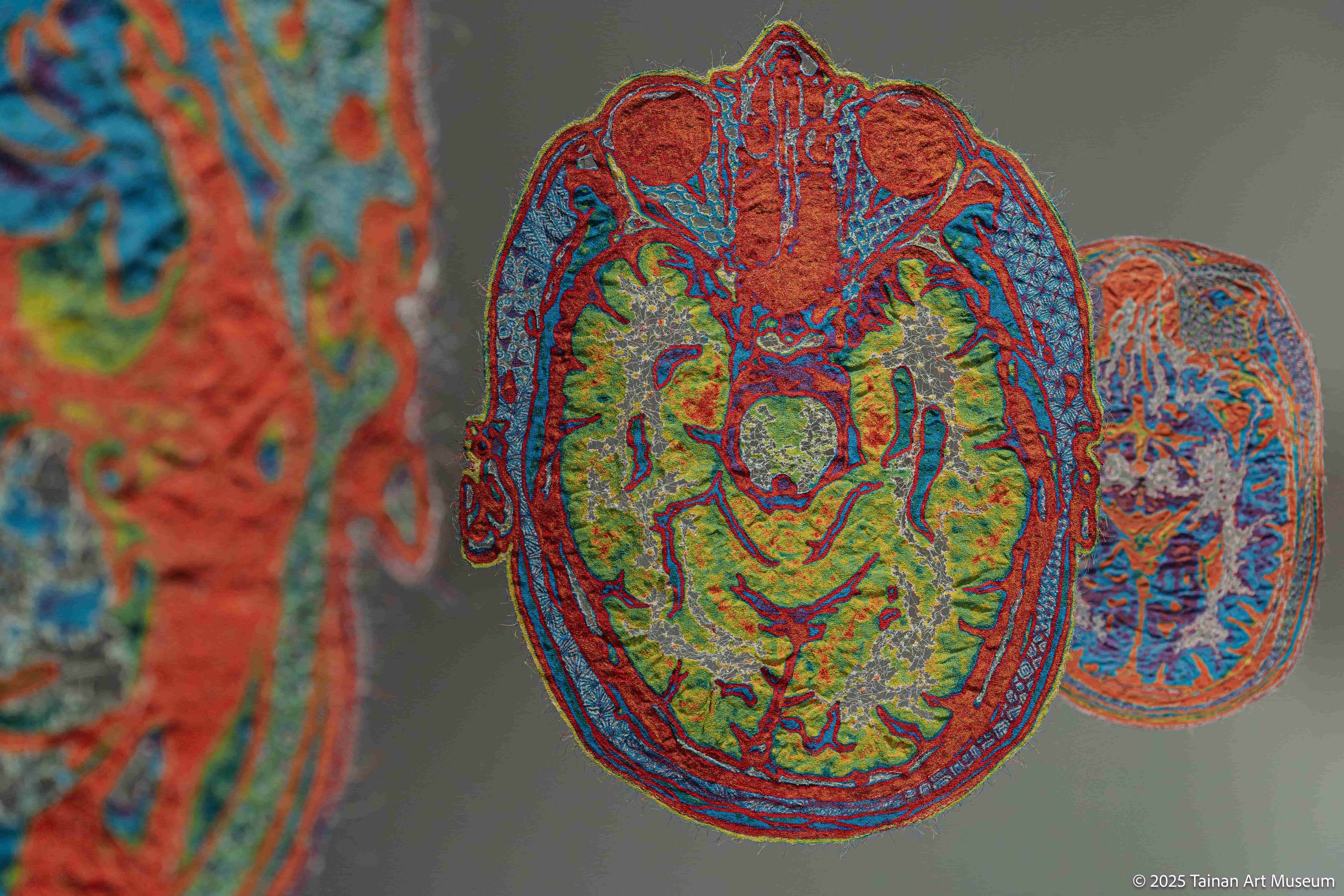「生と死:生命のリズムと心理 」がテーマの「Gallery D」の 宮⽥彩加さんの作品は、自身の体調が悪い時に撮影した背骨や脳のスキャン画像をミシンで縫い込んだもので、失敗や乱れを表現に活かしています。展示では円形に配置され、観客が作品をぐるりと回って鑑賞できるようになっています。 山下茜里さんは染色による作品を展示しており、人をテーマにしています。入口にある立体作品は無数の目がついており、妖怪のようにも細胞のようにも見える不思議な造形です。