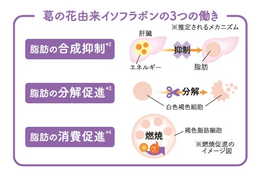 日本で古くから親しまれる健康素材「葛」の花から抽出した成分「葛の花由来イソフラボン*5」には、肥満気味の方*7の体重やお腹の内臓脂肪・皮下脂肪、ウエスト周囲径を減らす働きが。体内の脂肪を「増やさない」「分解」「消費」メカニズムで、おなかの脂肪を減らす助けをします。