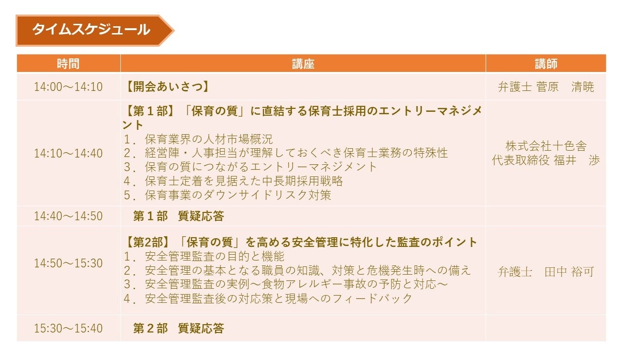 本シリーズセミナーでは、これから保育事業のM&Aを予定・検討されている法人様、異業種から保育事業へ参入された法人様を対象に、特にお問合せの多い「保育士採用」「園児の安全管理対策」「コンプライアンス遵守」の3つをテーマに、どのように戦略を組み立て、危機を予防し、効果的な園運営を実現すべきか、法的観点も踏まえてお伝えします。