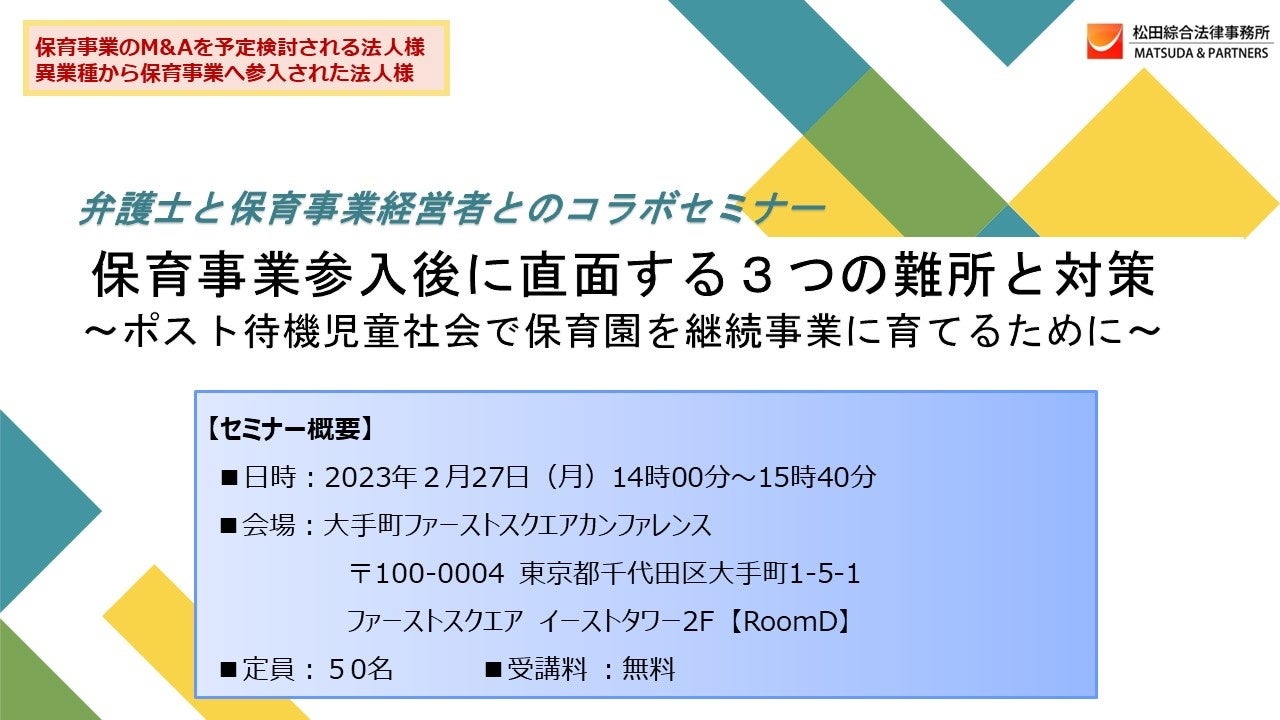 松田綜合法律事務所では、保育事業のM&Aを予定検討される法人様・異業種から保育事業へ参入された法人様向けにセミナーを開催いたします。