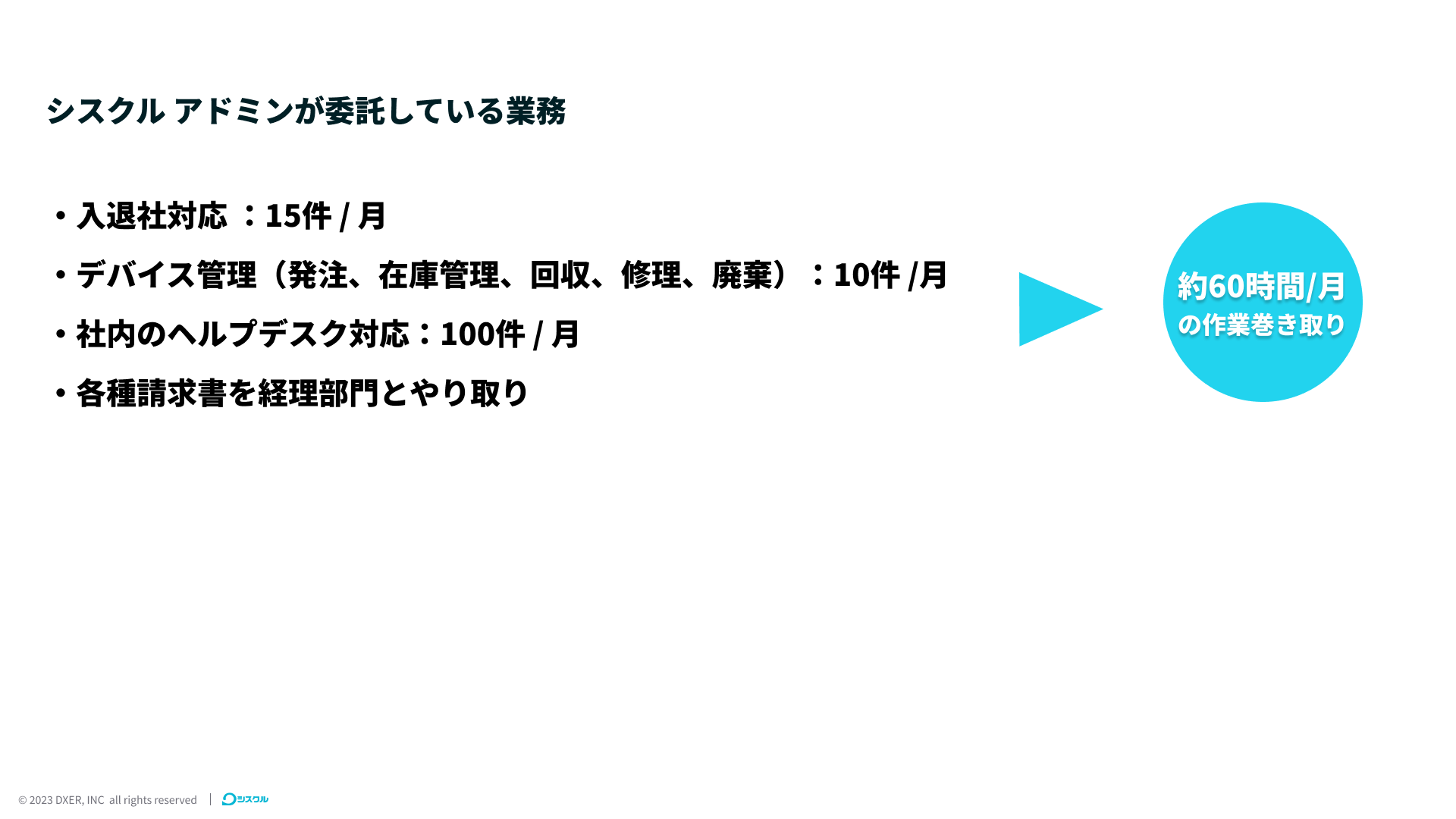 組織の急成長による情シス対応のスピード向上や業務効率化を目的として、運用における大部分の対応をシスクルに委託することをご依頼いただきました。