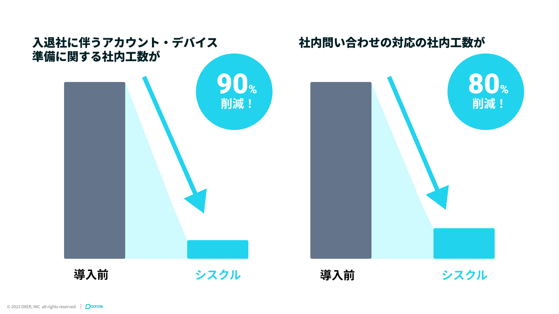弊社開発のプロダクトをご利用すると、入退社の申請がシームレスになり、人事・HR部門とのコミュニケーションコストを低減するメリットや、IT部門からアカウントとデバイスの準備などの業務をゼロに出来ます。