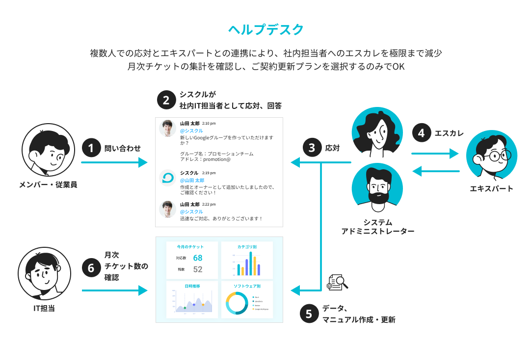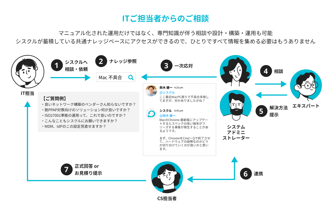シスクル アドミンとエキスパートの双方をご利用いただく事で、あたかも従業員のようにSlack上で応対が可能。