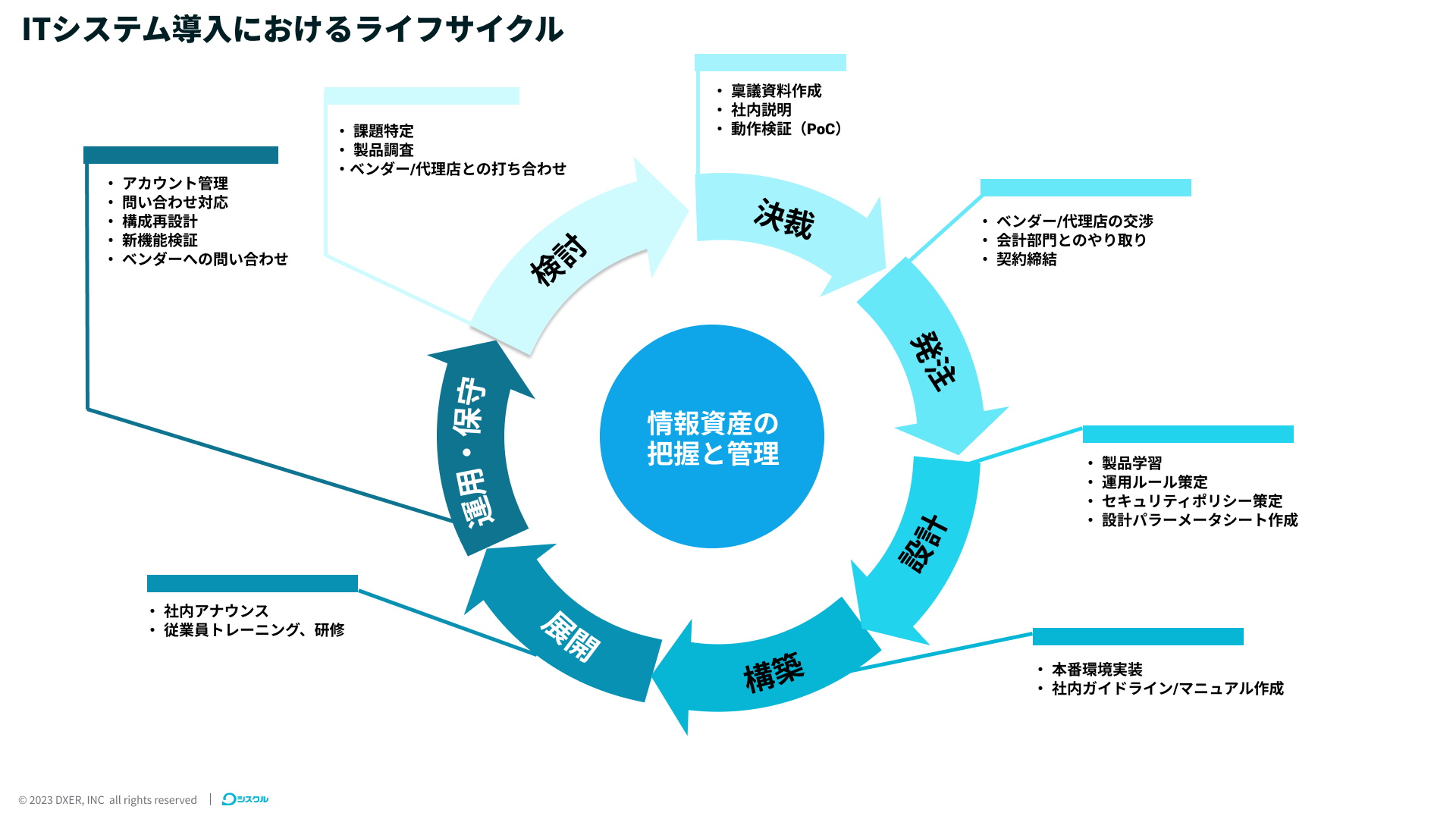 IT部門は下記プロセスのとおり、社内決裁のための稟議資料作成から設計や検証作業、また従業員向けの運用ルールの整備など業務が山のように存在します。