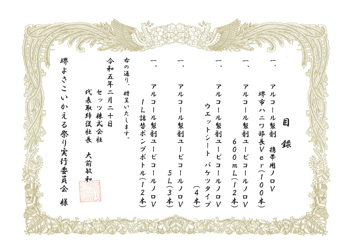 この度、当社は2023年2月26日(日)に開催される堺よさこいかえる祭り実行委員会主催のイベント「第11回 堺よさこいかえる祭り」に協賛することを決定し、2月20日(月)セッツ株式会社大阪支店にて寄贈式を実施いたしました。