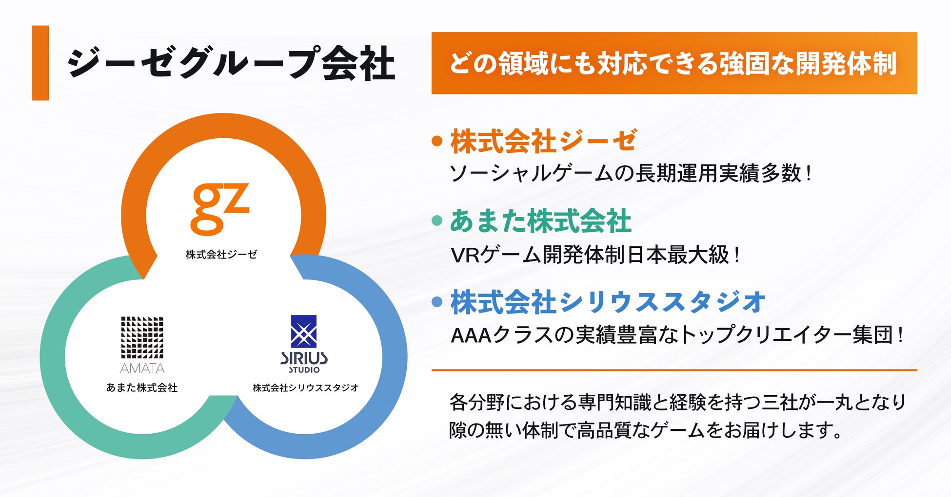 ジーゼグループはゲームデベロッパーという枠組みの中で、それぞれの強み・特徴を持っております。