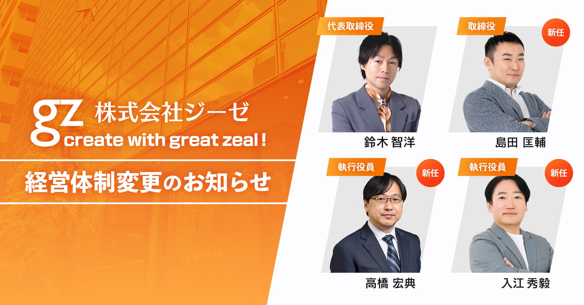 株式会社ジーゼ(大阪市西区、代表取締役:鈴木智洋、以下「当社」)は、この度あまた株式会社(以下「あまた社」)、株式会社シリウススタジオ(以下「シリウススタジオ社」)のグループ化に伴い、3社の経営体制の強化を図るため、新たな取締役、執行役員の就任をお知らせいたします。