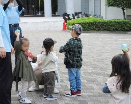 グラウンド、中庭、校舎前に隠された宝物をみんなで探しました。宝物はミニ消しゴム、シール、スーパーボール、ビーズで作ったアクセサリーなどが入ったガチャガチャカプセルで、学生の手作り。子どもたちは宝物を見つけて「あったよ!」と元気にはしゃいでいました。
