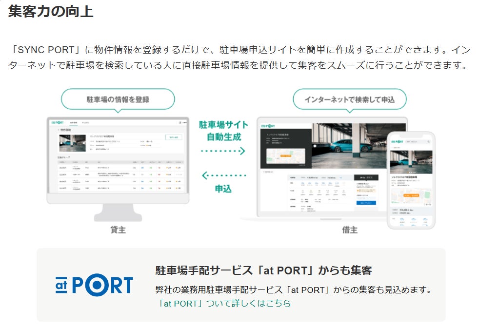 「SYNC PORT」は、パーキングAIエージェント「at PORT」、及び、衛星×AIをベースにした月極駐車場オンラインマーケット「PARK STOCK(11月正式リリース予定)」と連携しており、駐車場利用が必要な建設業などの事業者ユーザーや駐車場をお探しの一般ユーザー等のからの集客率向上が期待できます。従来の月極駐車場検索・契約サイトは、ポータルサイト機能とインターネットからの申込機能が主流でしたが、「SYNC PORT」は、「at PORT」と「PARK STOCK」との連携により、申込~契約・管理の業務効率化のみならず、稼働率向上が実現出来ます