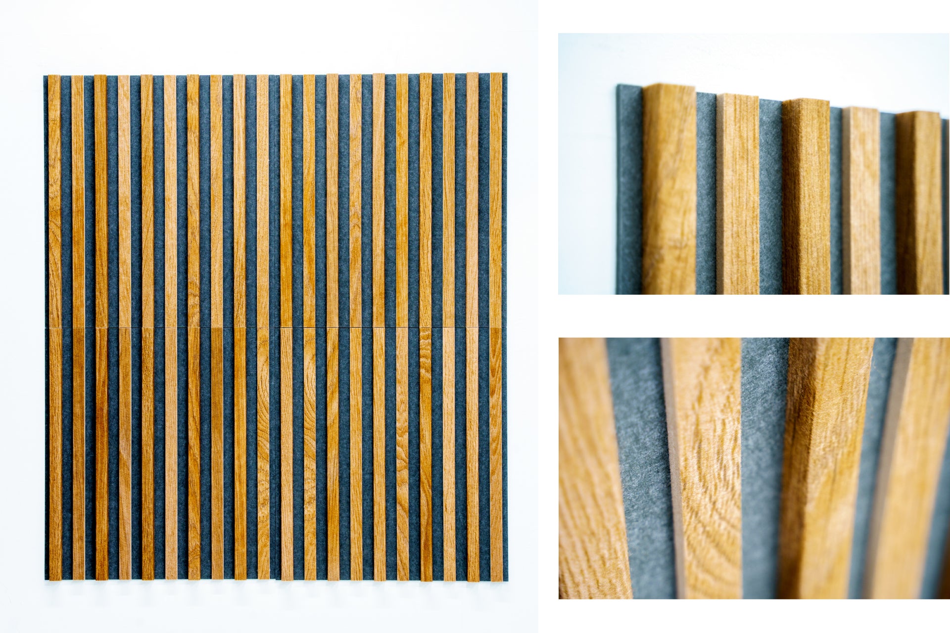 見た目のデザイン性にもこだわった凸凹の吸音面を採用することで、効率的な吸音・拡散を実現しました。この設計により、音が均等に広がり、室内の音響環境がより快適になります。また、パネルの厚みを異なる形で配置することで、中~高周波数帯域に対する吸音性能を最適化し、バランスの取れた音環境を提供します。木目調の見た目はどのような部屋にもなじみやすく、装飾としても使い勝手の良いパネルに仕上げました。