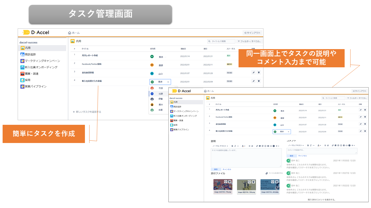 全てのユーザーがタスク管理をより簡単にできるよう、新しいタスク管理画面をリリースしました。タスク一覧はリストビュー形式で表示されます。また数クリックでタスク作成、担当者割り当て、期日設定からステータスの変更ができ、同一画面上で各タスクに対する説明文やコメント入力まで可能な仕様となっています。ツール内の表記はすべて日本語にカスタマイズされており、言語の壁を心配することなく海外の利便性の高いツール機能をご利用いただけます。