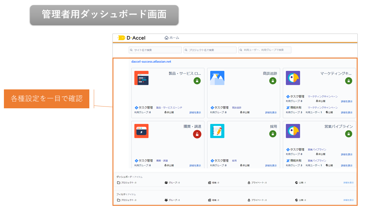 外部からの攻撃に堅固なクラウドツールでも、管理者の単純な設定ミスによるセキュリティーのインシデントは常に課題として存在します。このようなリスクを低減するために、ぽちっとDXのプロジェクトやスペースに対して、安全な権限が設定されているかどうか一目でわかるダッシュボードを用意しました。各プロジェクトの公開設定やユーザー権限もまとめて確認できるため、安心・安全にご利用いただけると同時に管理者のツール管理負担を軽減します。